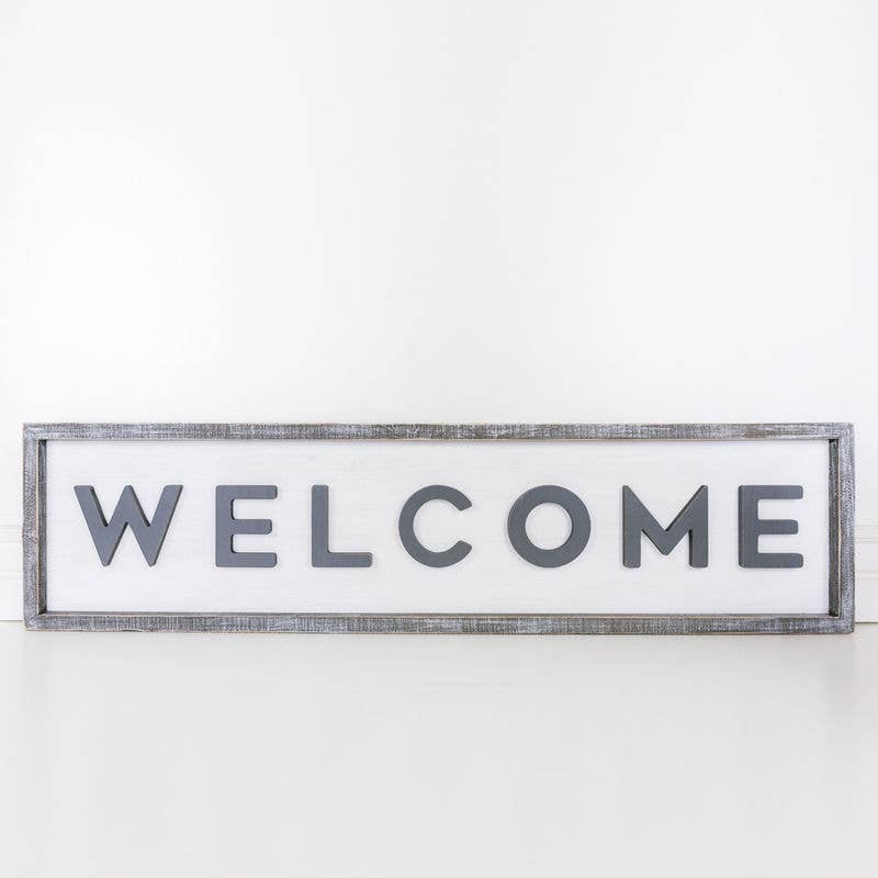 Wood framed reversible sign (WELCOME) white/black/grey. From our "All raised up" Collection. These signs are reversible! Two looks in one sign (a white side with pewter grey lettering, and a black side with white lettering.) Change your design with just a flip. Also features raised wooden lettering on both sides.