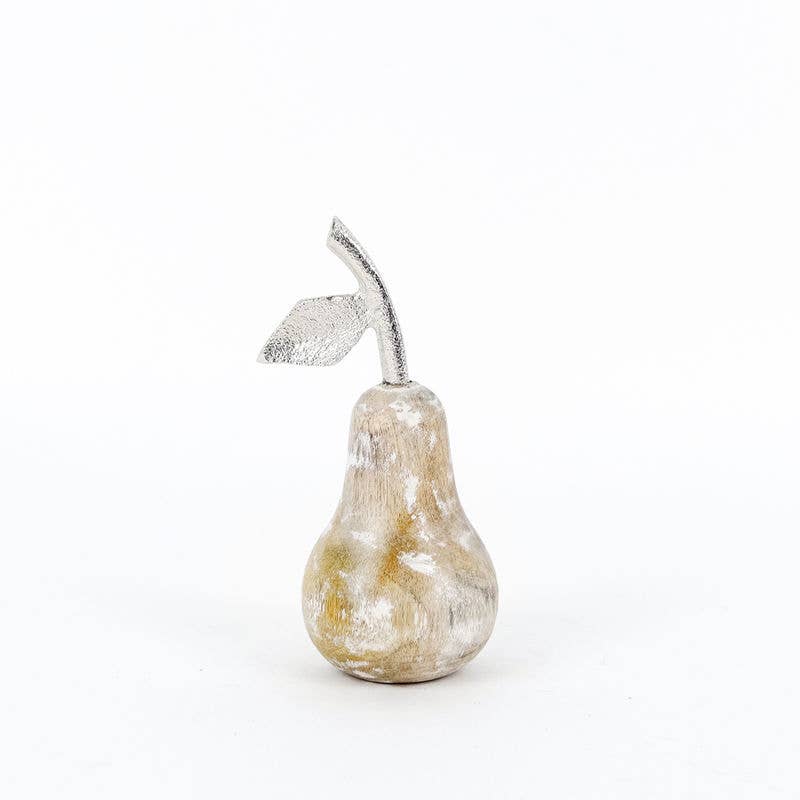 Mango wood shape (PEAR) natural/silver. Our mango wood pieces are carved from the mango tree, a sustainable hardwood from India. The visible colors and grain variance make each piece not only beautiful, but completely unique.