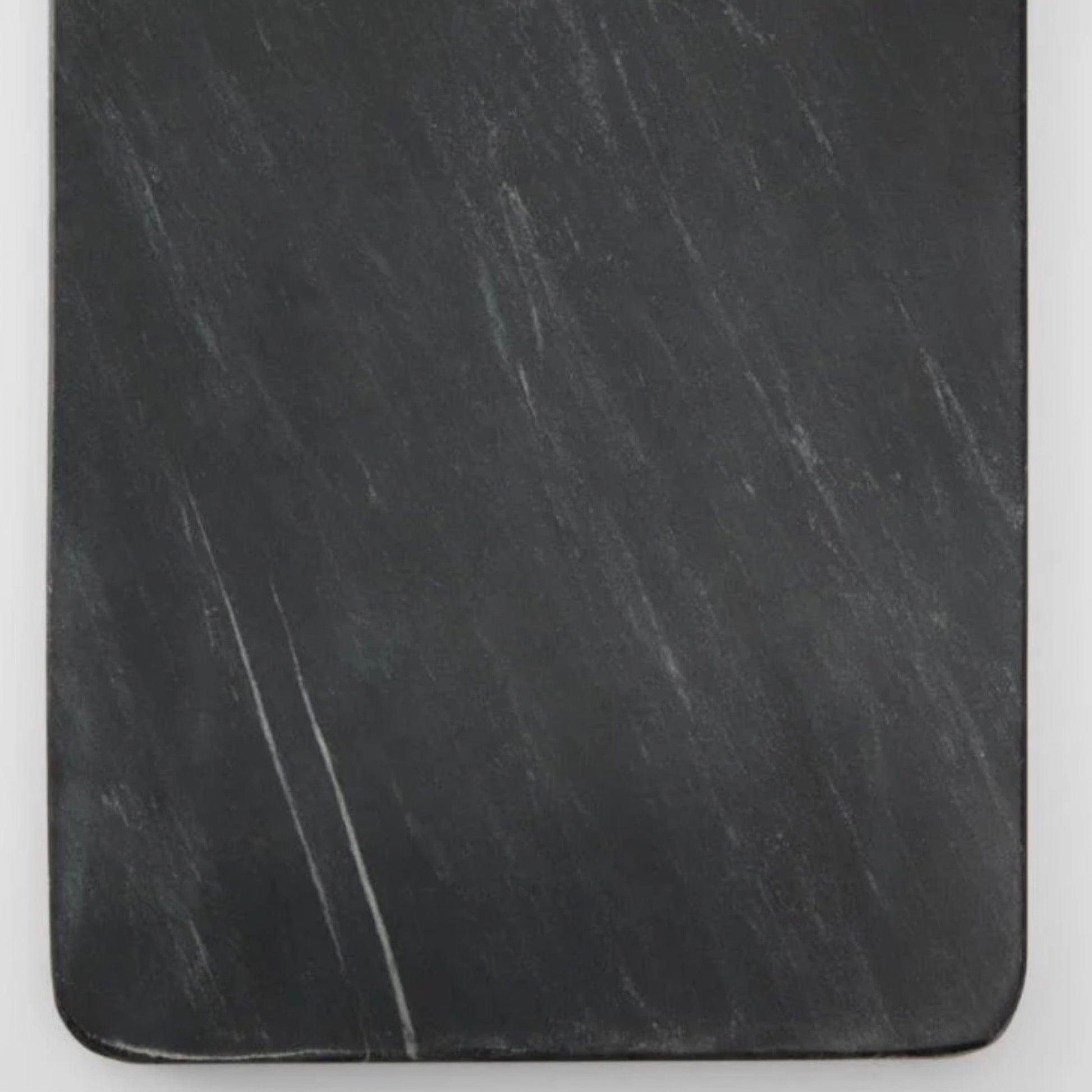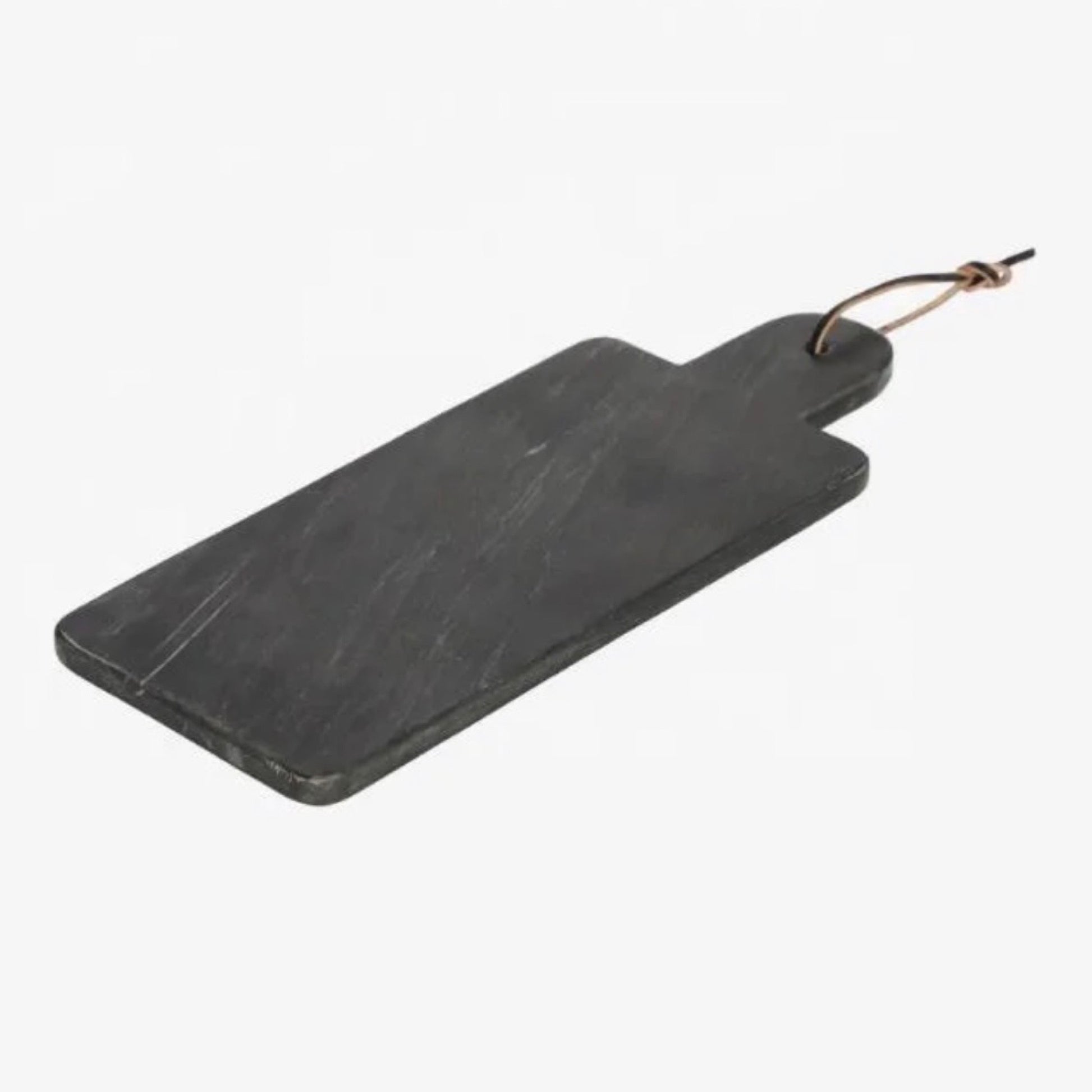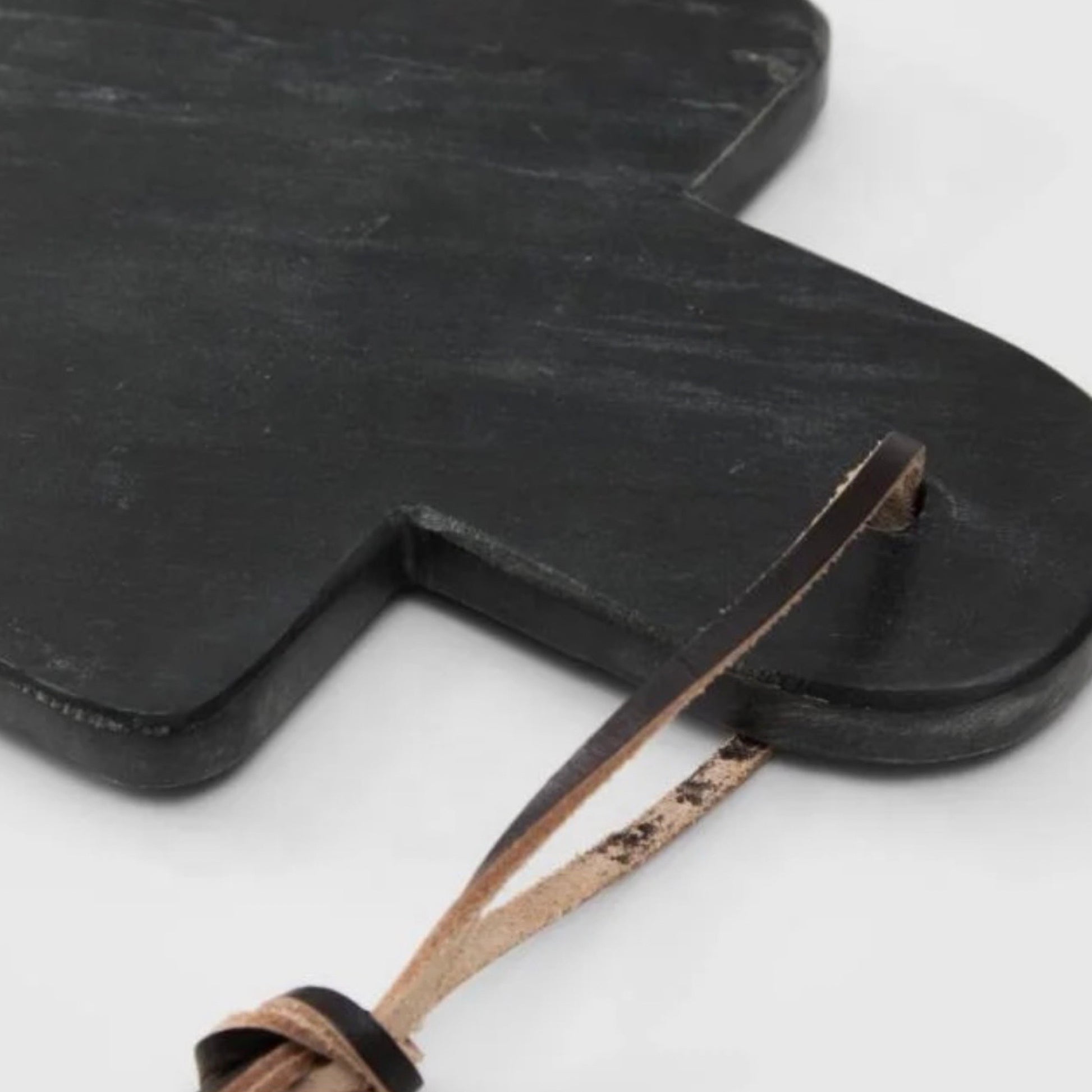 A sophisticated cutting board made of black marble with a handle and a leather tie for easy storage and display.