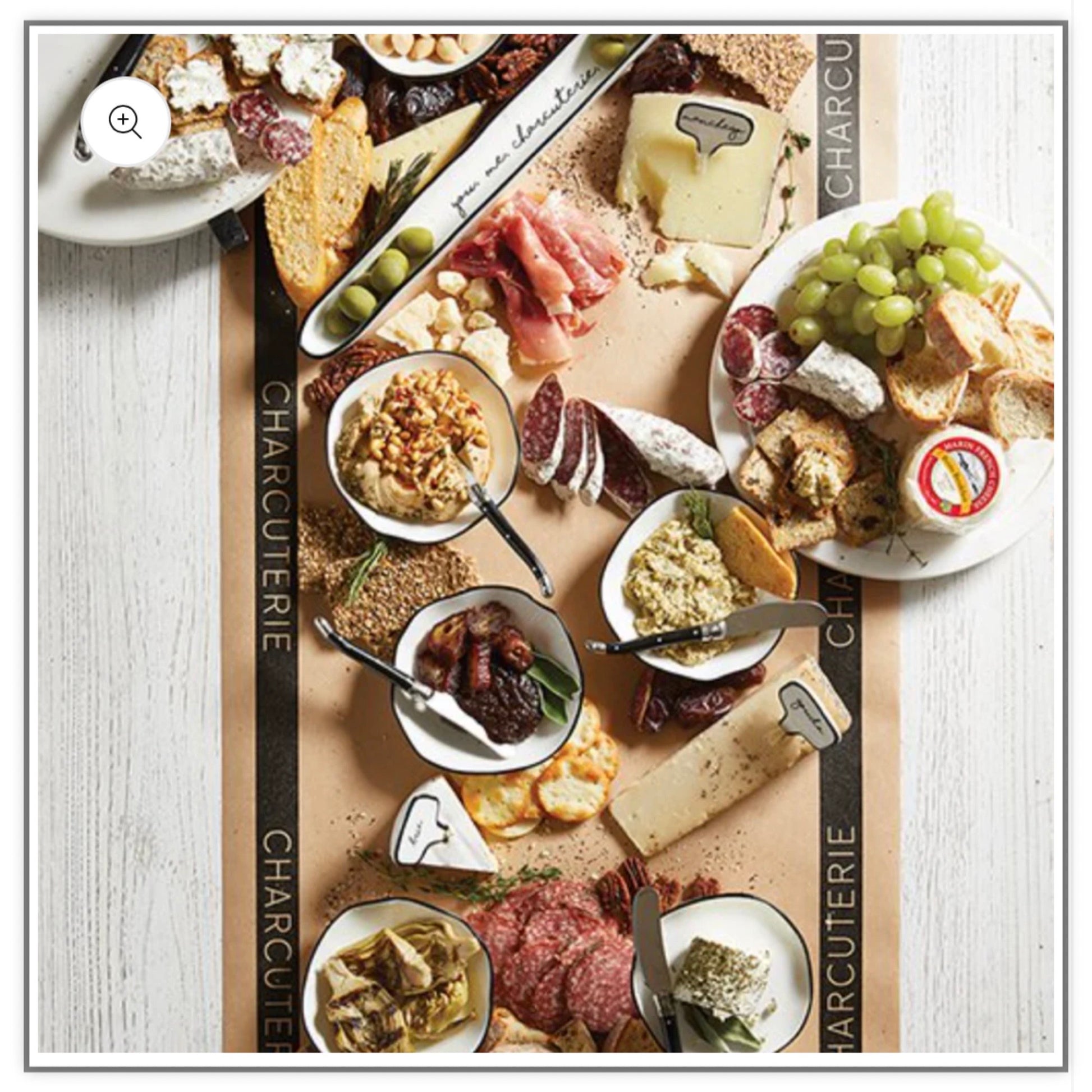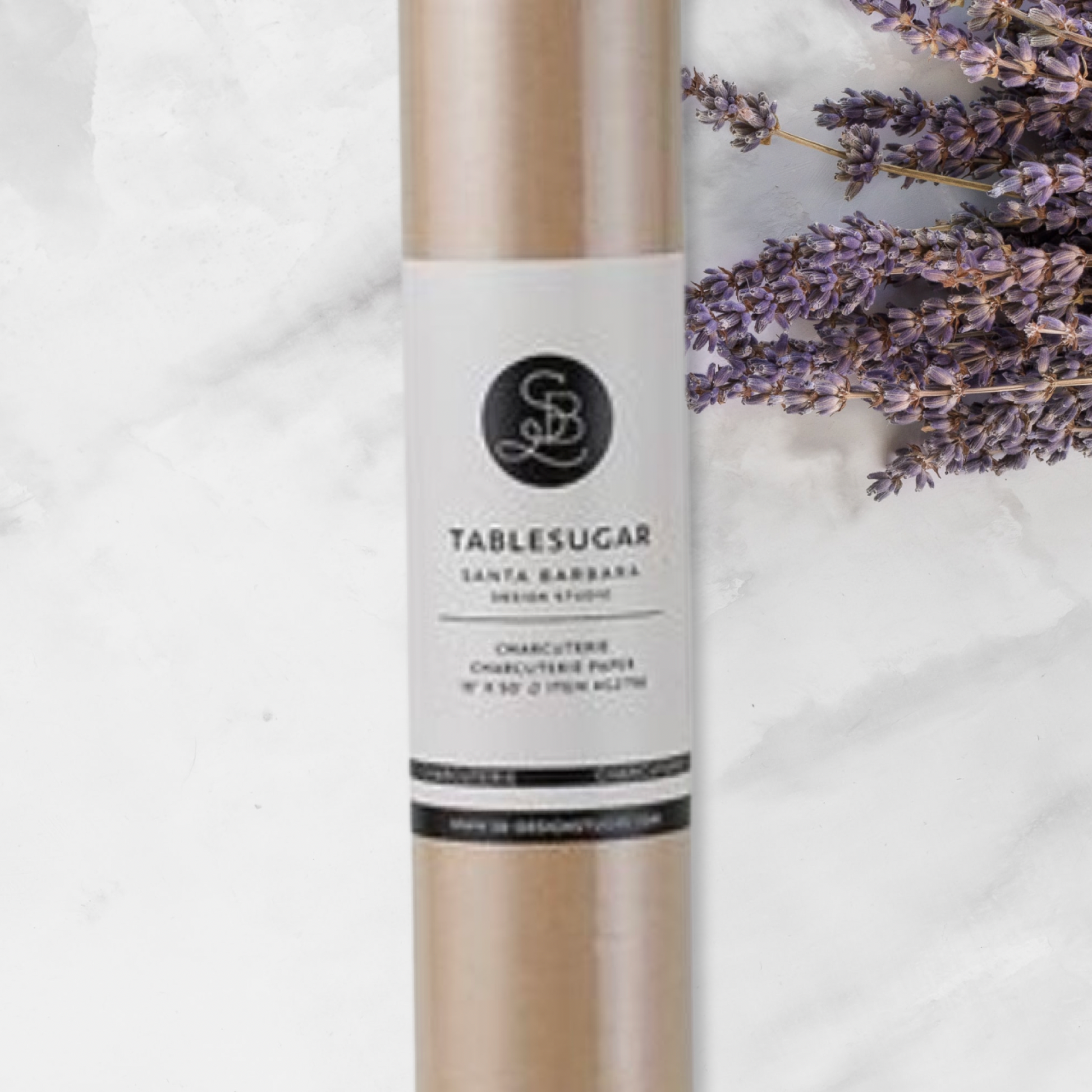 Perfect for creating a large charcuterie board without needing a large board. Roll out on a table, island or other large surfaces. Makes for easy cleanup and storage. Paper acts as a perfect liner for all meats and cheeses. Each roll is 50 feet long and and 18 inches wide. Runner can be cut to desired size. Elegant design has the script, charcuterie, printed along the sides. Use as a base for other serving dishes. Modern, minimalist design.