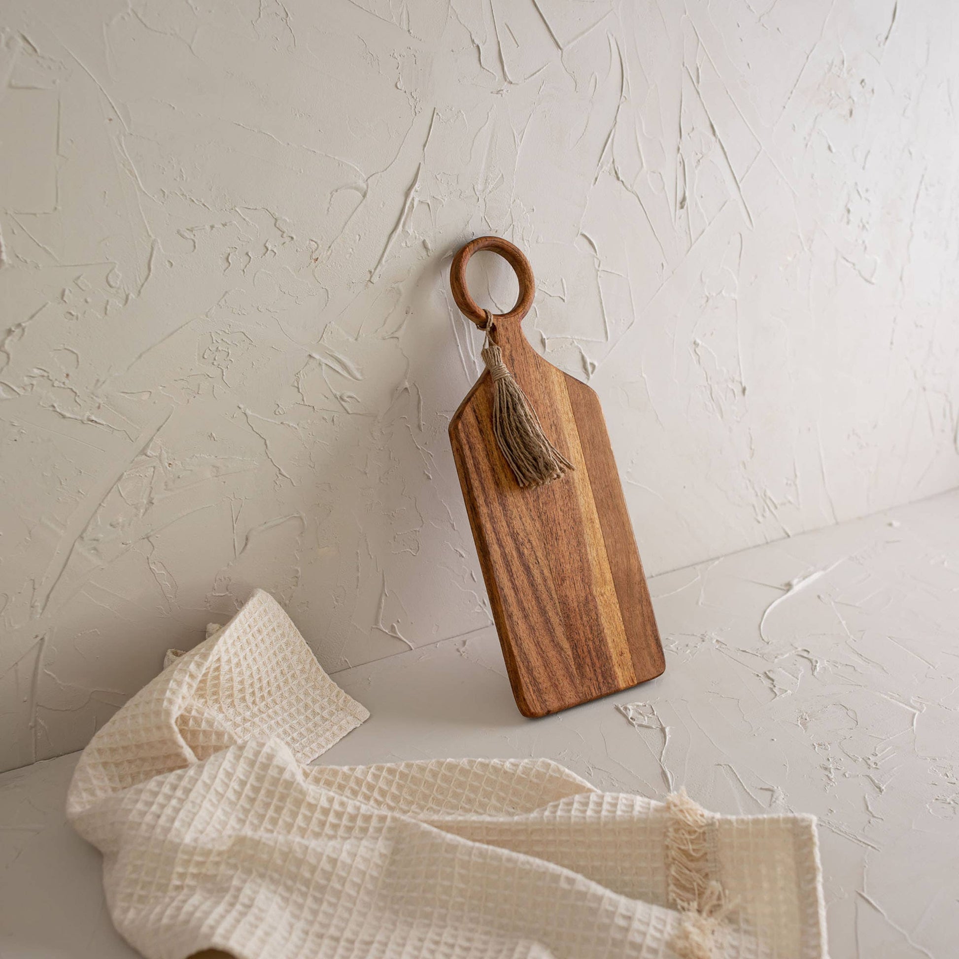 Simple in style and unique in shape, this cutting board is perfect for preparing, serving, and entertaining. Functional in size, yet beautifully crafted from sustainable acacia wood that is naturally strong and durable. Finished with a decorative loop at the top that is functional to use for hanging, and a hand tied natural jute tassel.