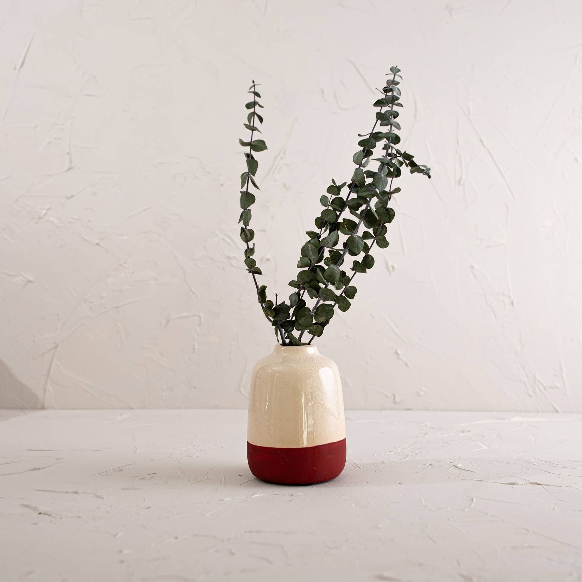 A gorgeous bud vase to pair with modern or boho aesthetic. A classic high gloss crackle glaze over natural stoneware is accented by a deep red matte glaze for a pop of color at the base. This raw textural earthenware vase easily transitions from season to season with its subtle color, and is great for faux stems, fresh stems or as a standalone accent.