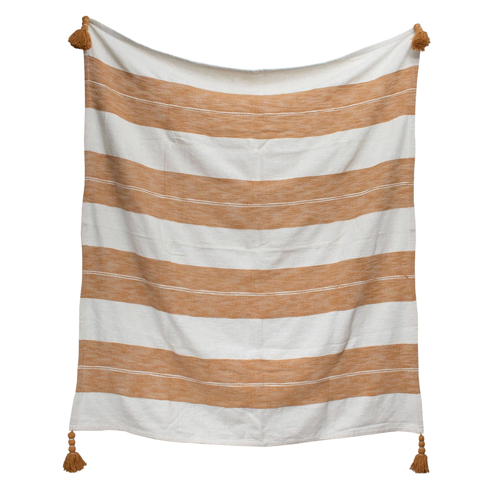 -A mustard and white cotton throw with bold woven stripes and elegant thread wrapped tassels.