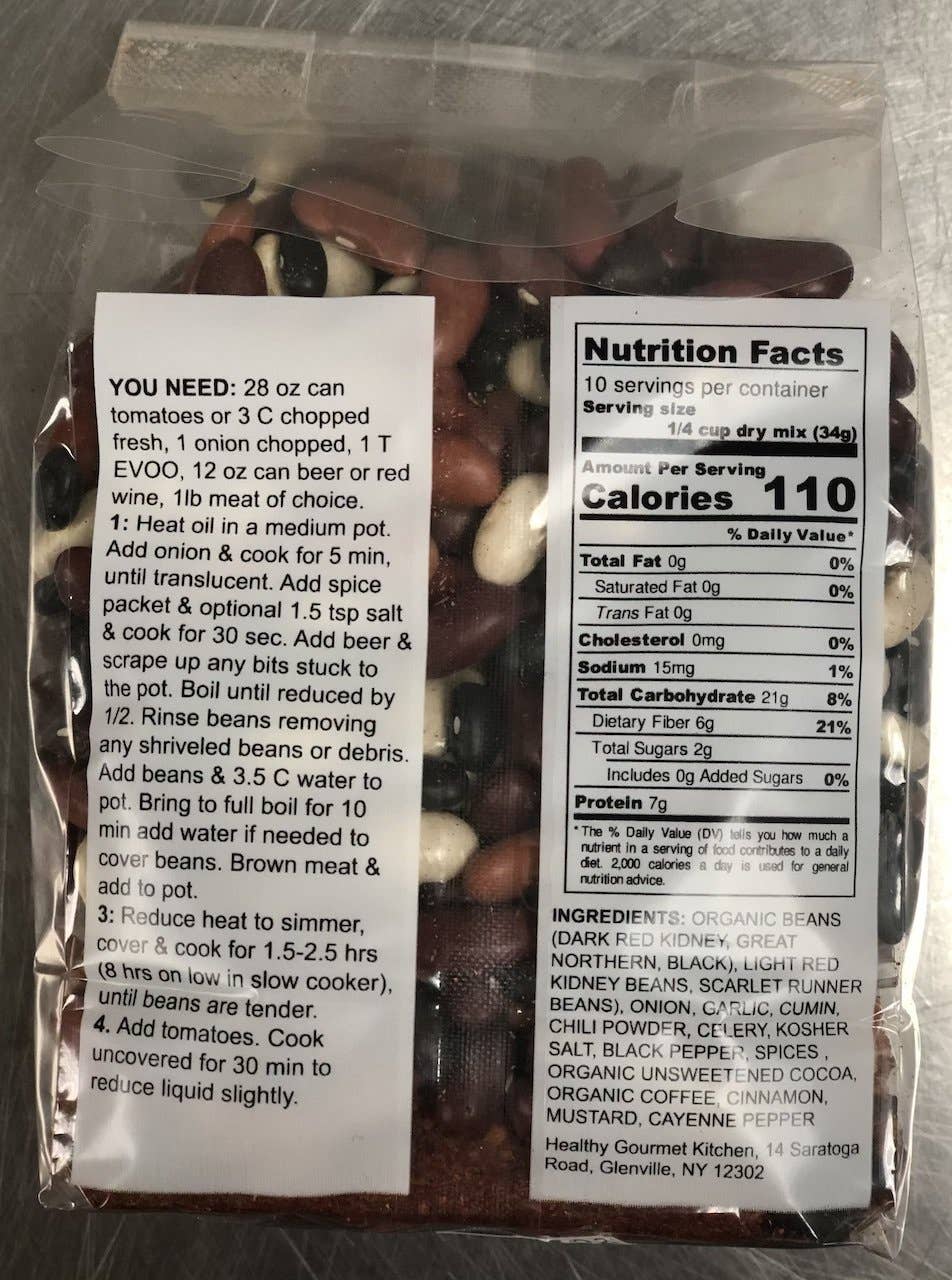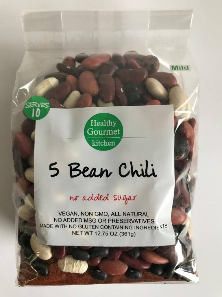 Our 5 Bean Chili is mild with plenty of flavors! Made with heirloom beans, premium spices with no added sugars and very low sodium.