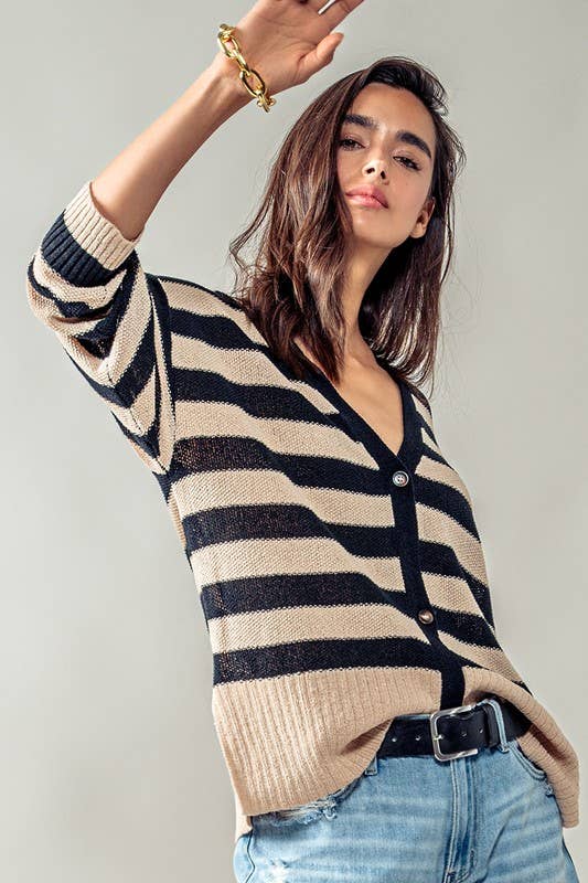 Striped Knit Cardigan with Ribbed Trim