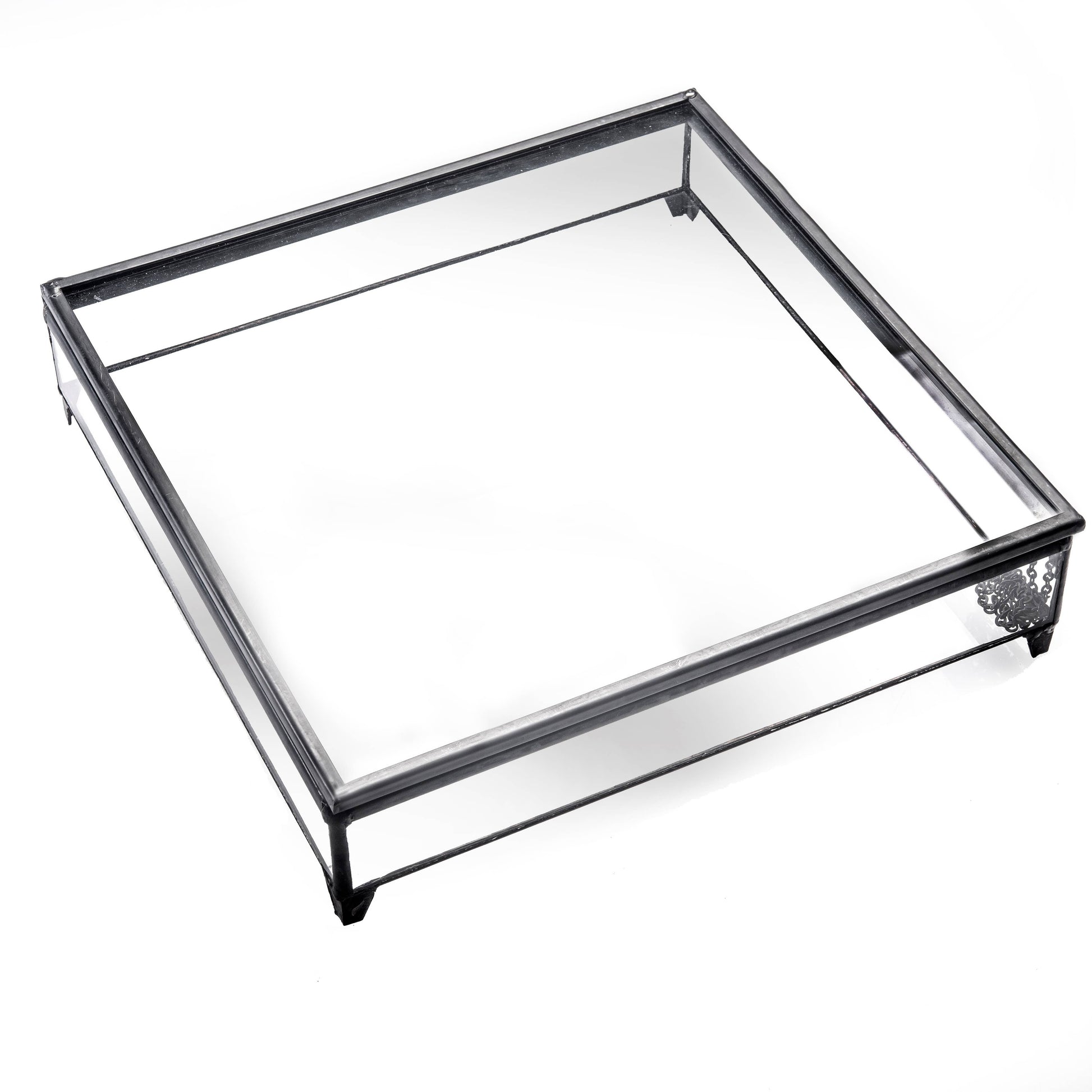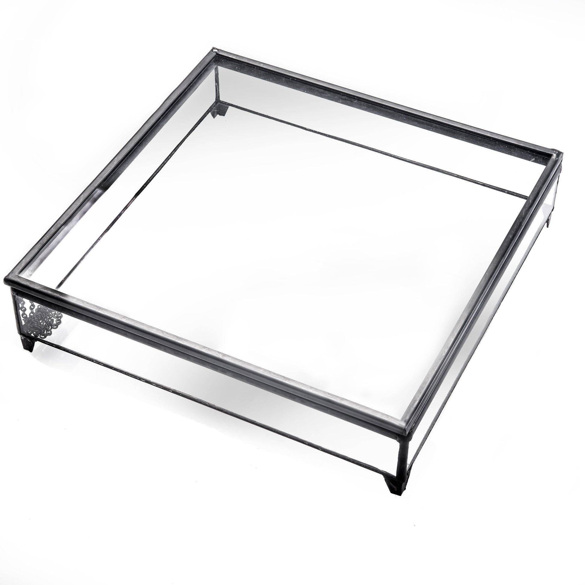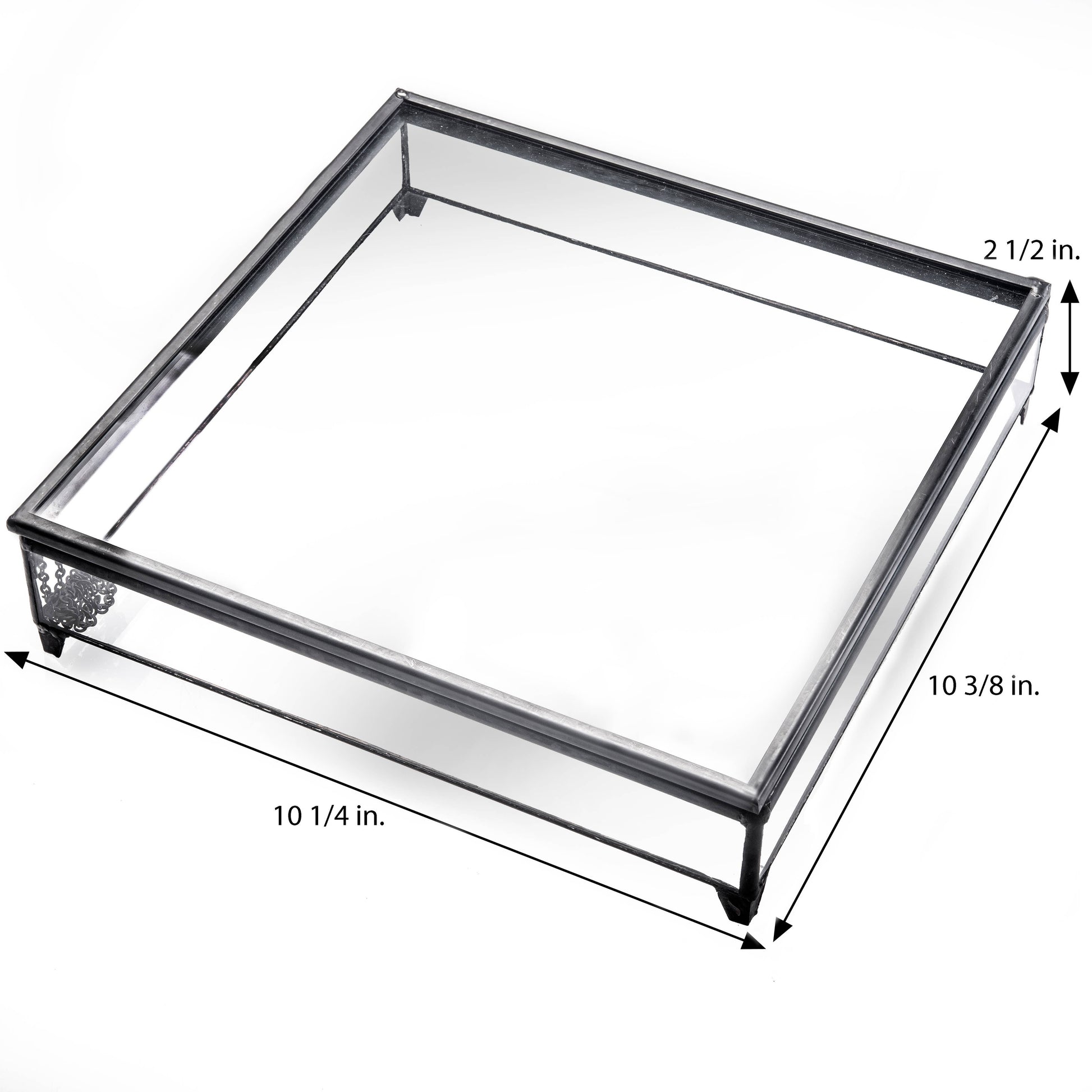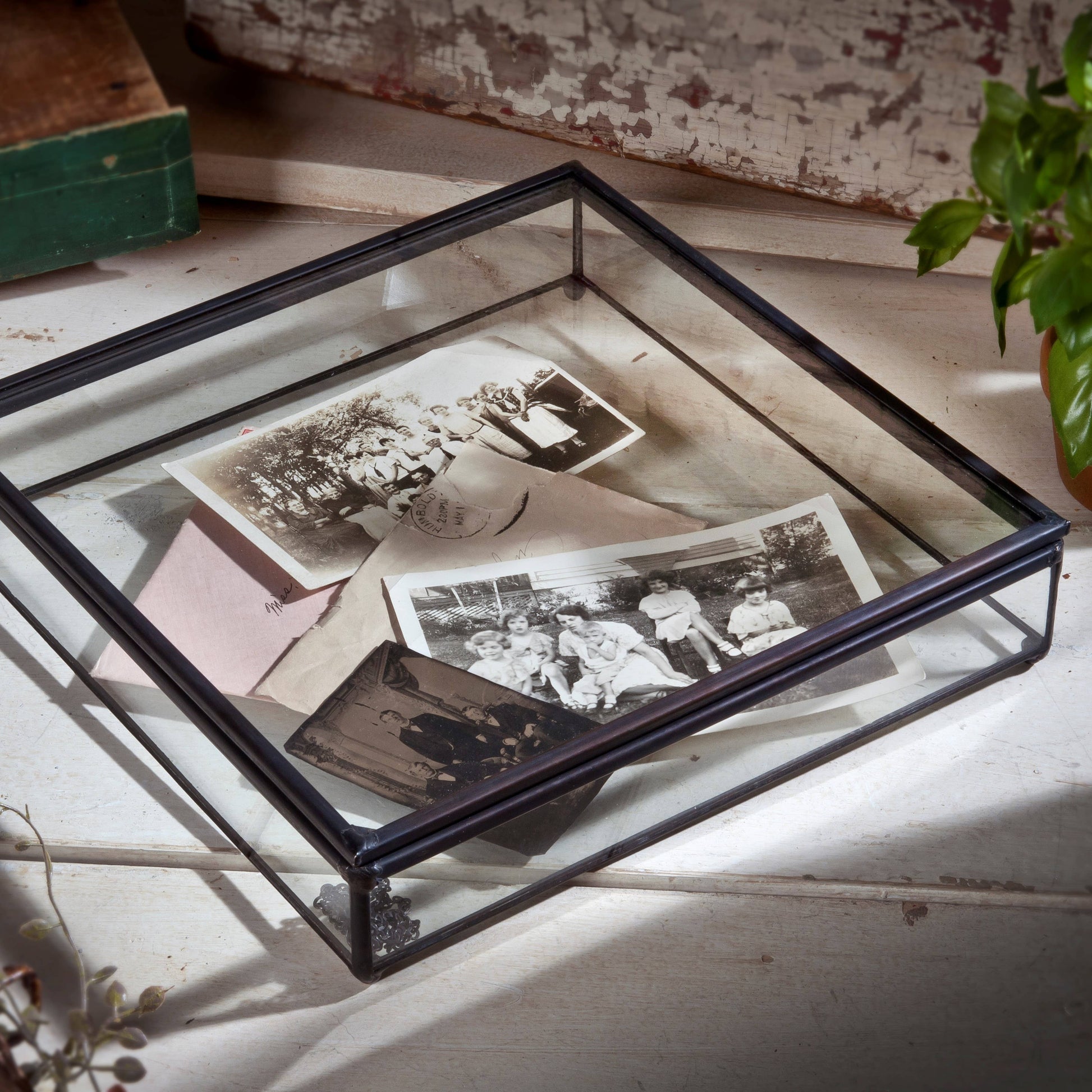 Spread your keepsakes out in this shallow (interior is 1 1/2" deep) clear glass display box. Don’t let those favorite mementos from the kids, vacations or the keepsake from grandma sit in the bottom of a drawer. Keep them on display to warm your heart with memories. With clear smooth glass, black metal trim and angular box feet it has style. Decorative keepsake box ideal for the coffee table, end table, or dresser.