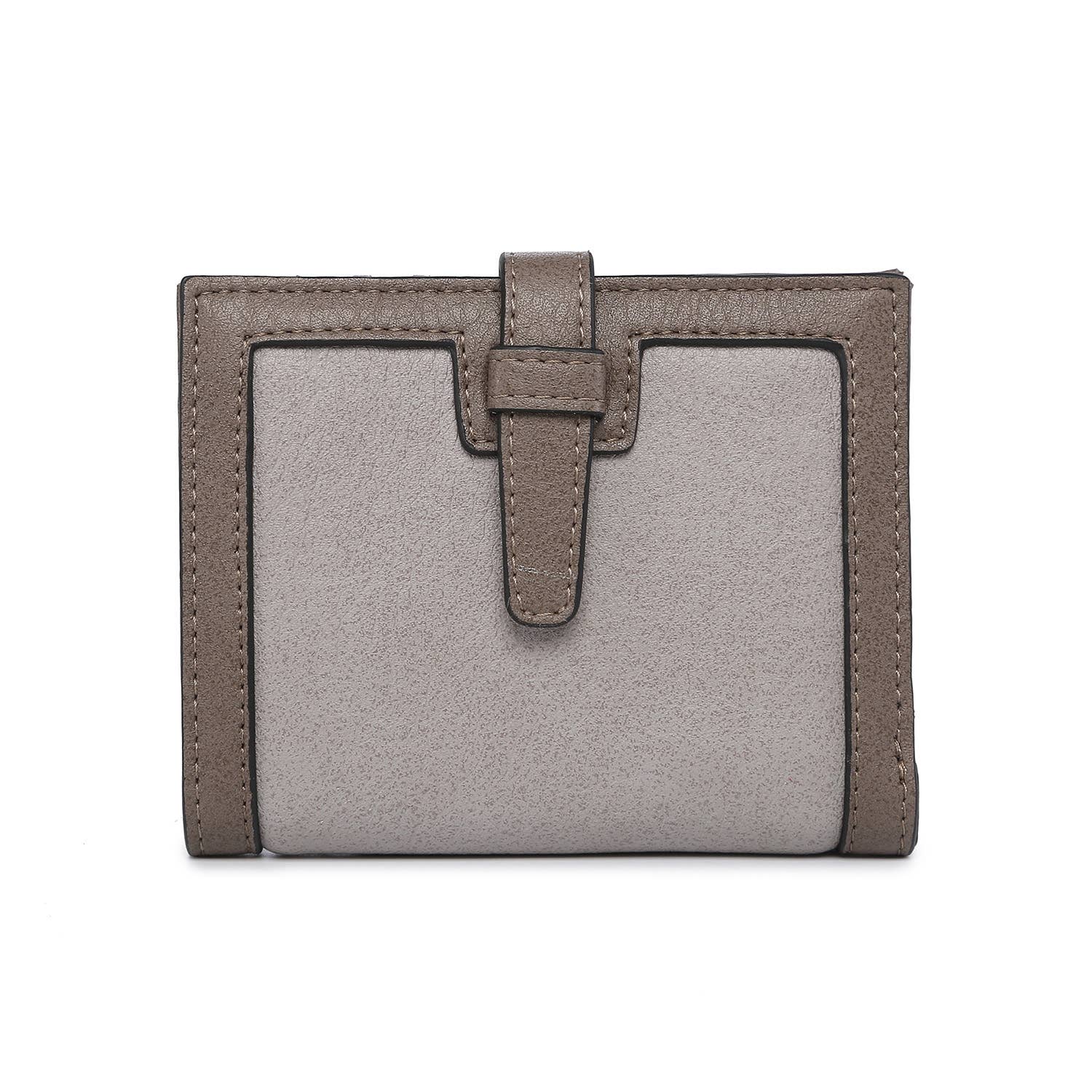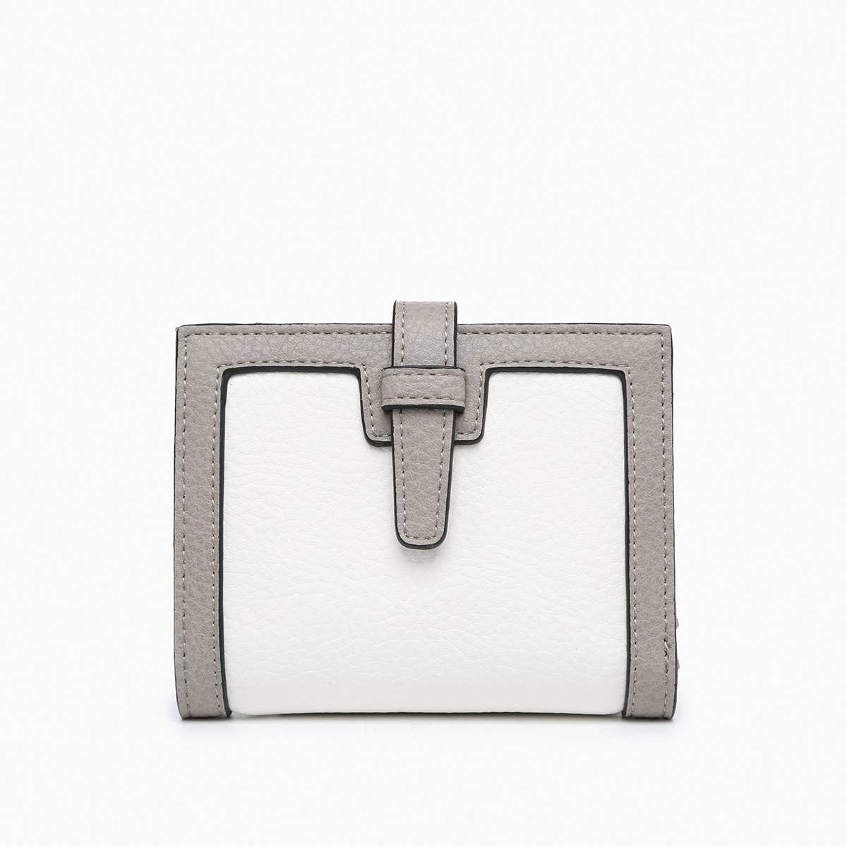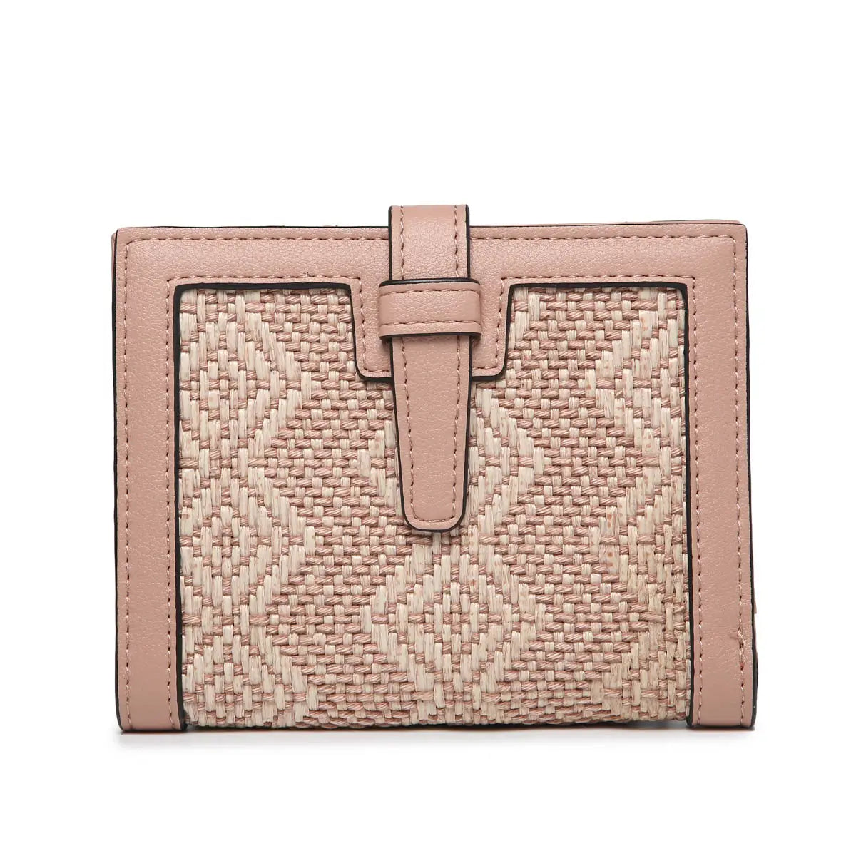 Contrast bi-fold style Slip closure Large slip pocket ID/card slot holder Woven/canvas material with vegan leather accents