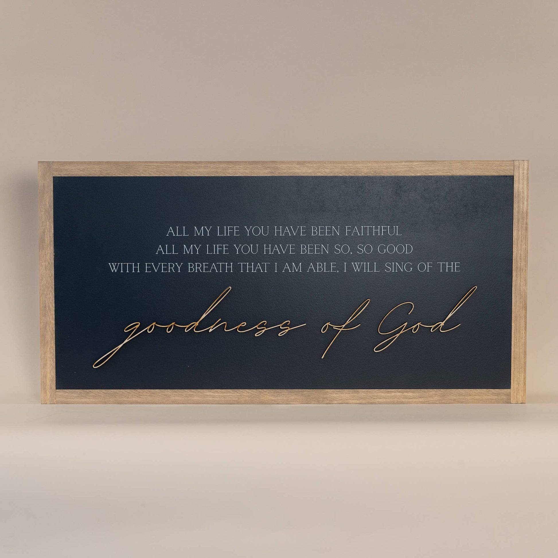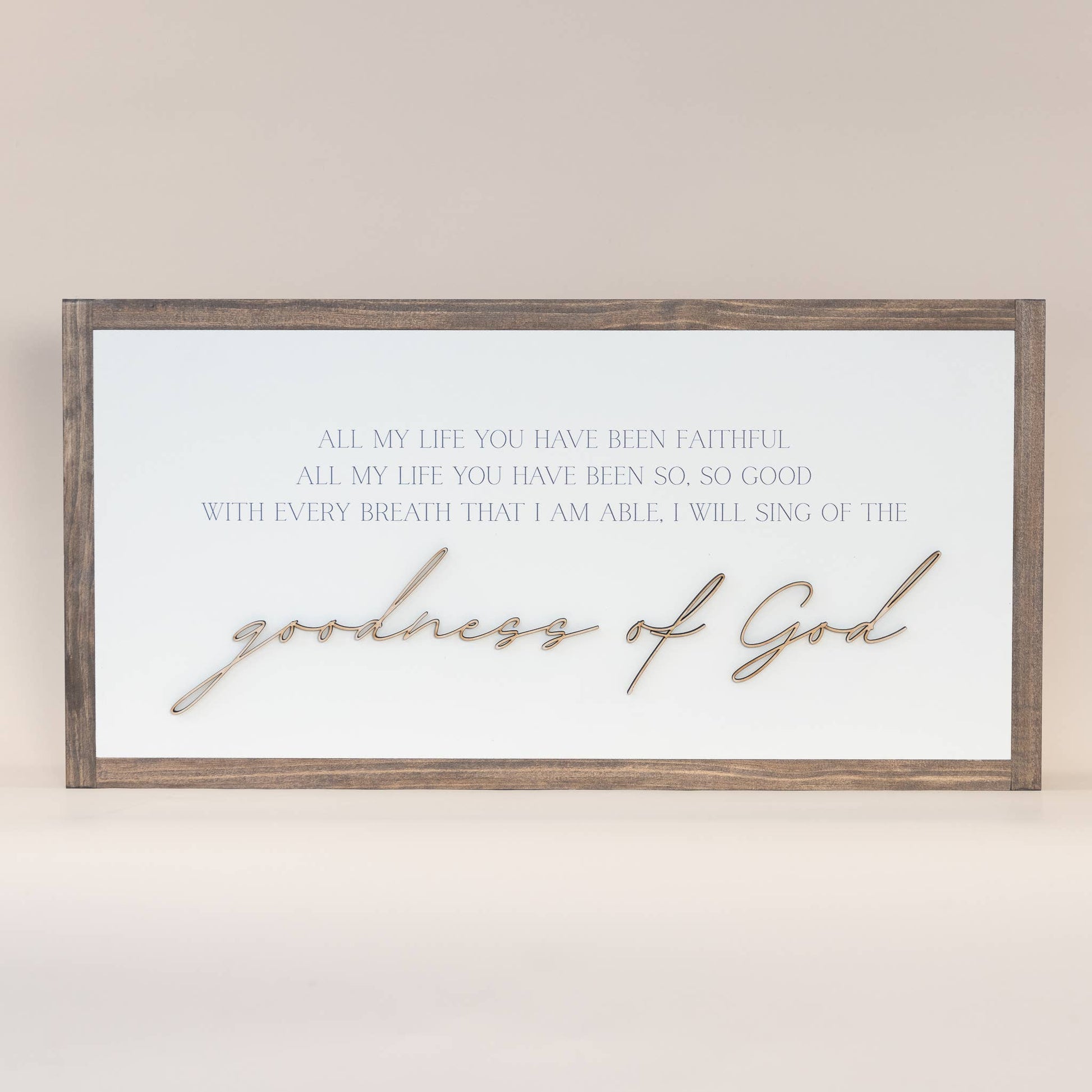 Goodness of God: Soft White-Black Text / Light Brown Frame / 45 inches by 23 inches