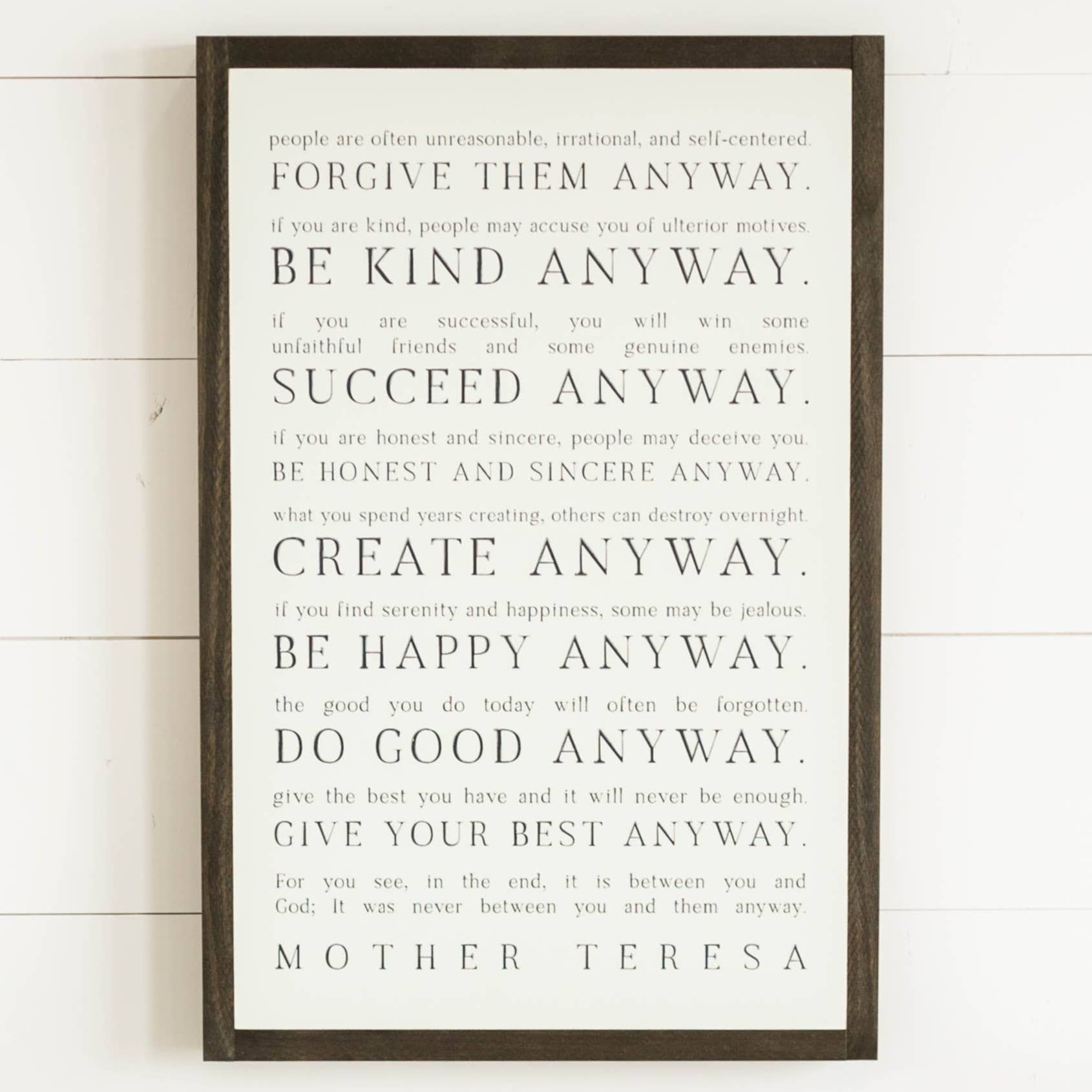 This Mother Teresa quote deserves a spot in every home: "People are often unreasonable, irrational, and self-centered. Forgive them anyway. If you are kind, people may accuse you of ulterior motives. Be kind anyway. If you are successful, you will win some unfaithful friends and some genuine enemies. Succeed anyway. If you are honest and sincere, people may deceive you. Be honest and sincere anyway. What you spend years creating, others can destroy overnight. Create anyway. If you find serenity and happiness, some may be jealous. Be happy anyway. The good you do today will often be forgotten. Do good anyway. Give the best you have and it will never be enough. Give your best anyway. For you see, in the end, it is between you and God; it was never between you and them anyway."