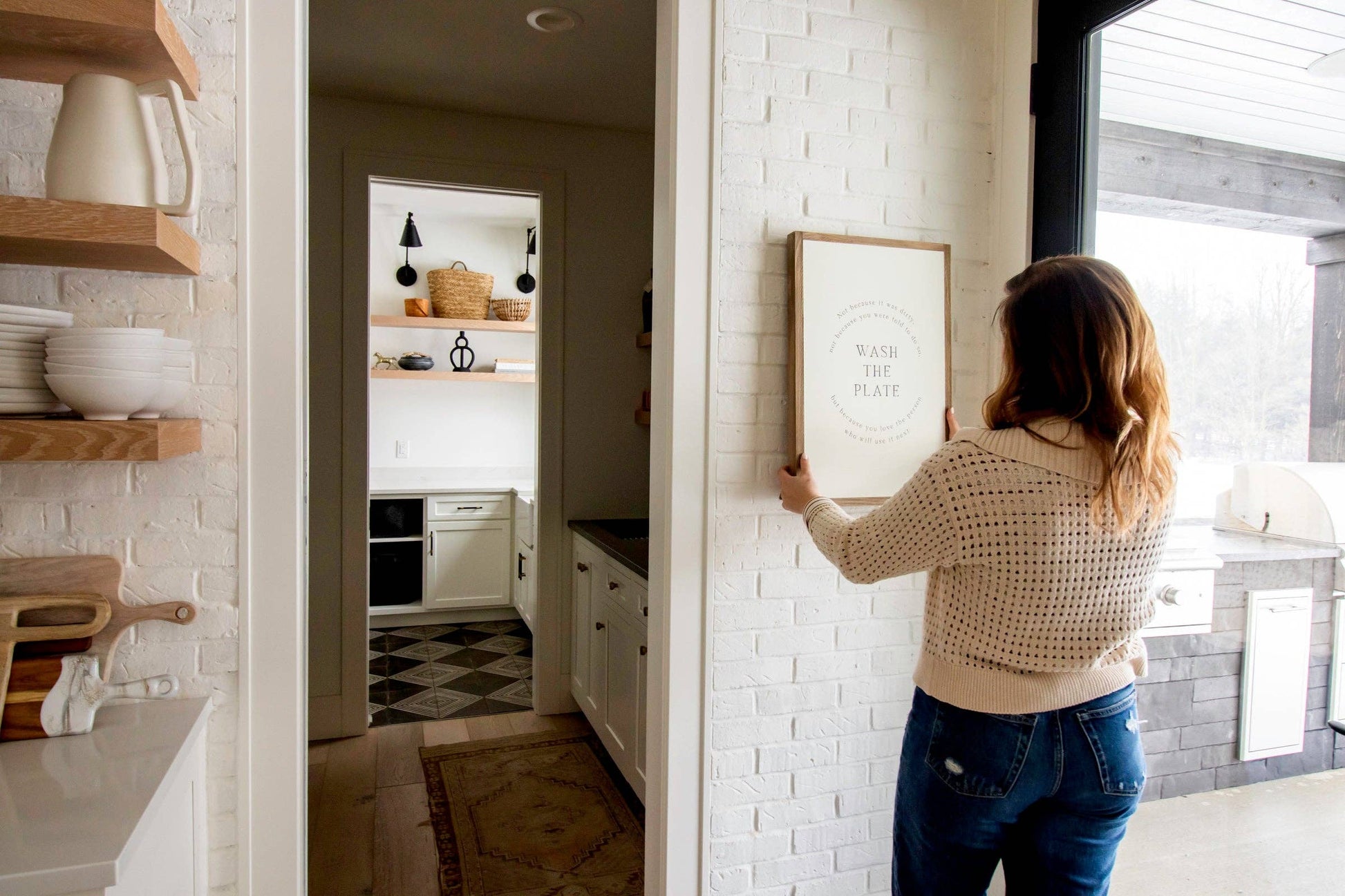 Wash the Plate | Wall Art: Soft White-Black Text / Light Brown Frame / 8 inches x 12 inches