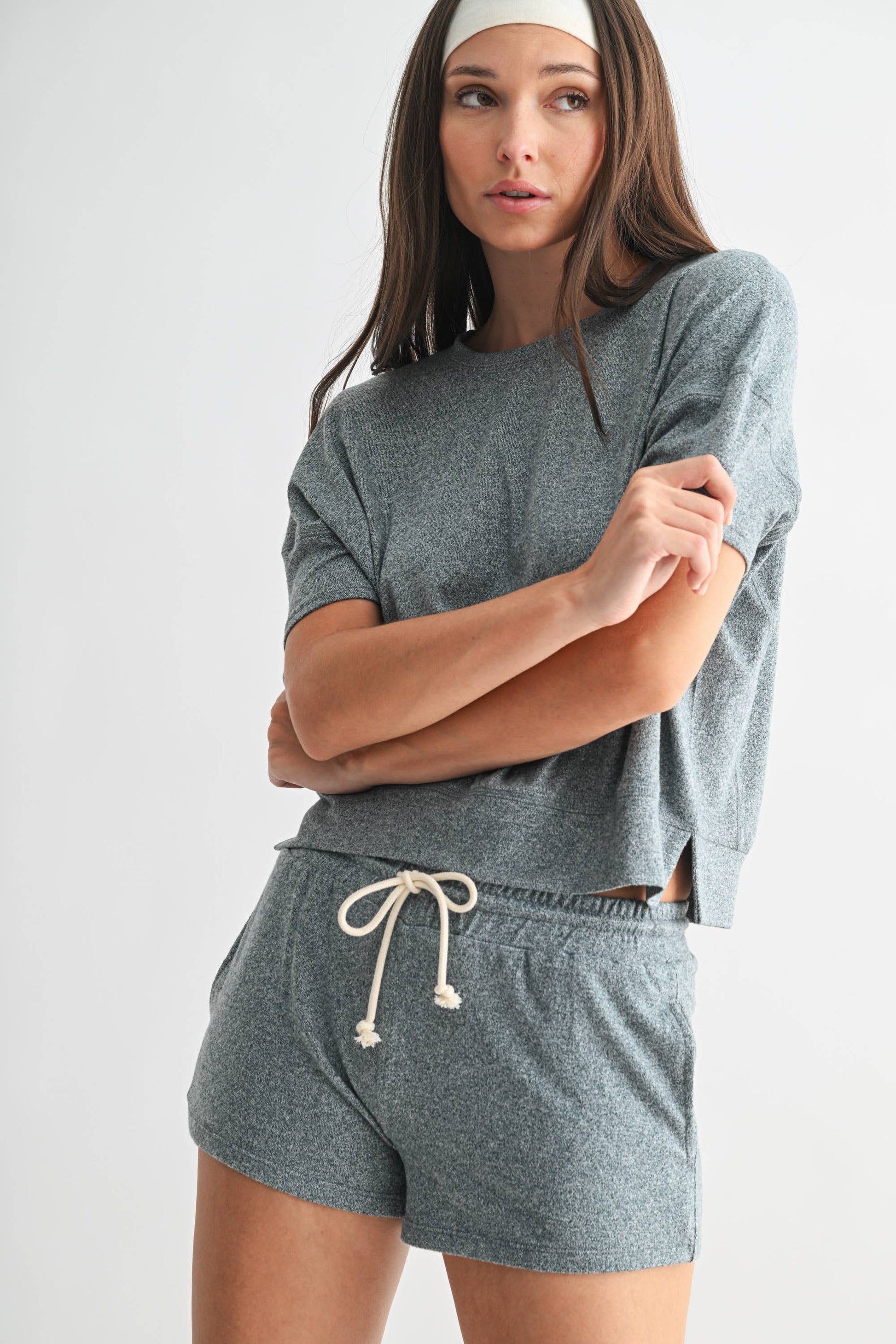 Relaxation has never looked or felt this good. Crafted from brushed Hacci fabric that’s soft as a cloud, this crewneck short-sleeve top effortlessly transitions from sleep to lounge to lifestyle. The dolman sleeves provide a relaxed fit with plenty of arm mobility, while side slits add ease and freedom of movement. Perfectly versatile, it pairs beautifully with your favorite Hacci pants for a cozy, coordinated look.