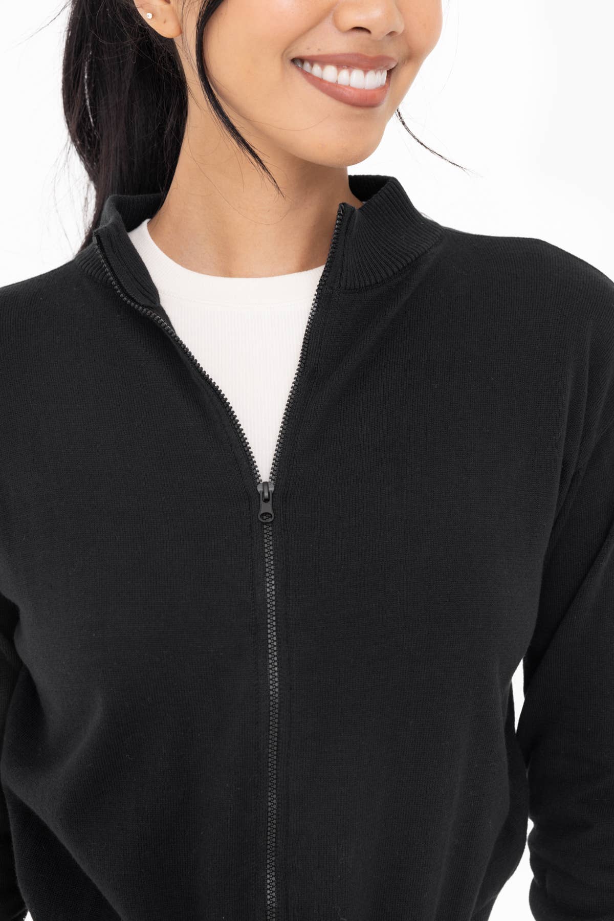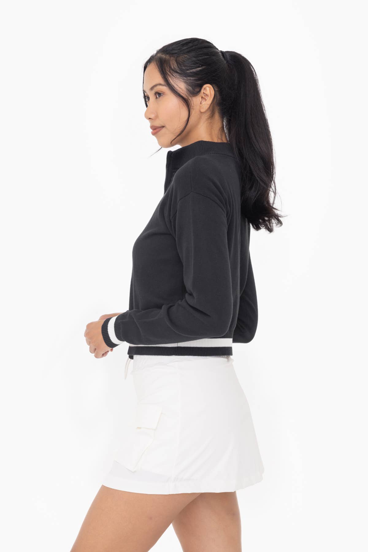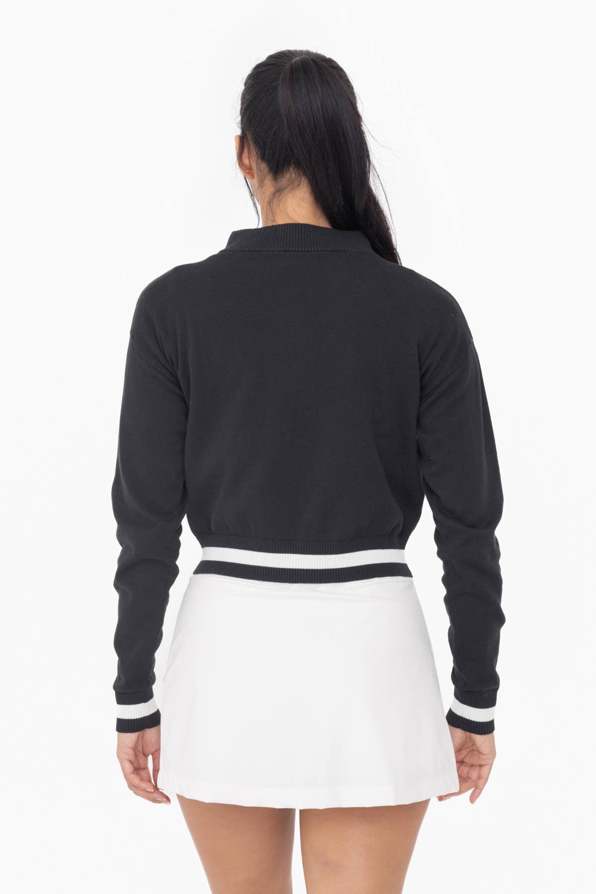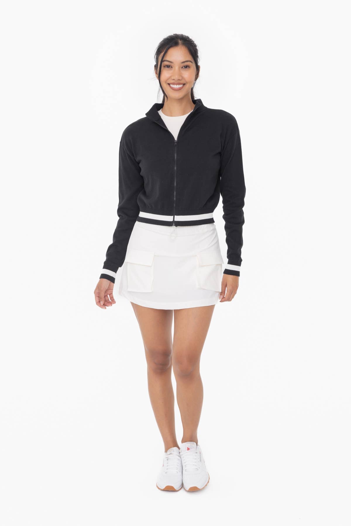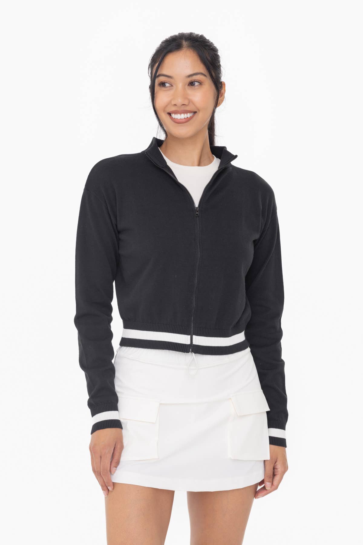 Perfect as a layering piece with your casual or active looks, this lightweight tennis/golf jacket is the ultimate balance of sporty and sweet! It features a full front zip, retro stripe details at the hem and cuffs, and sits comfortably at the natural high hip for a covered but trendy silhouette.