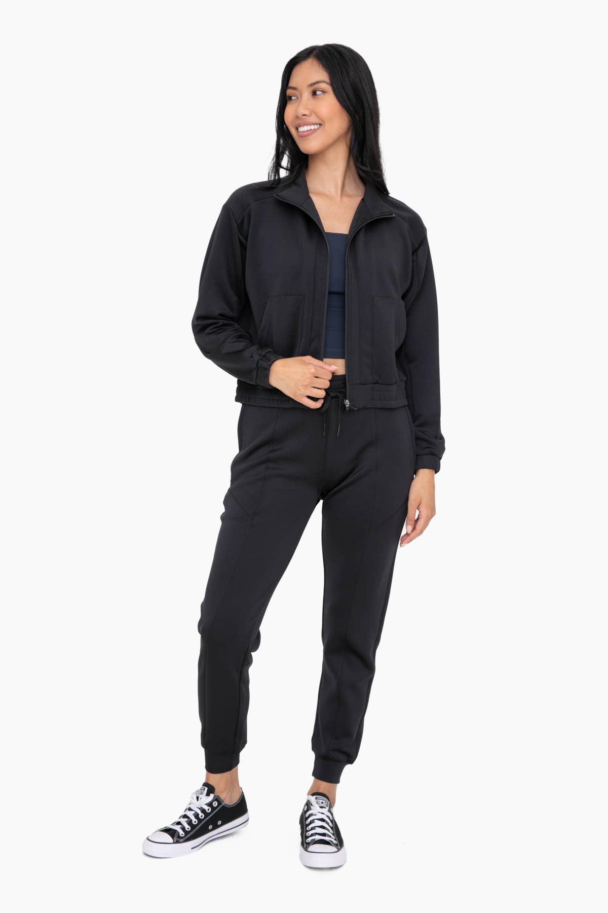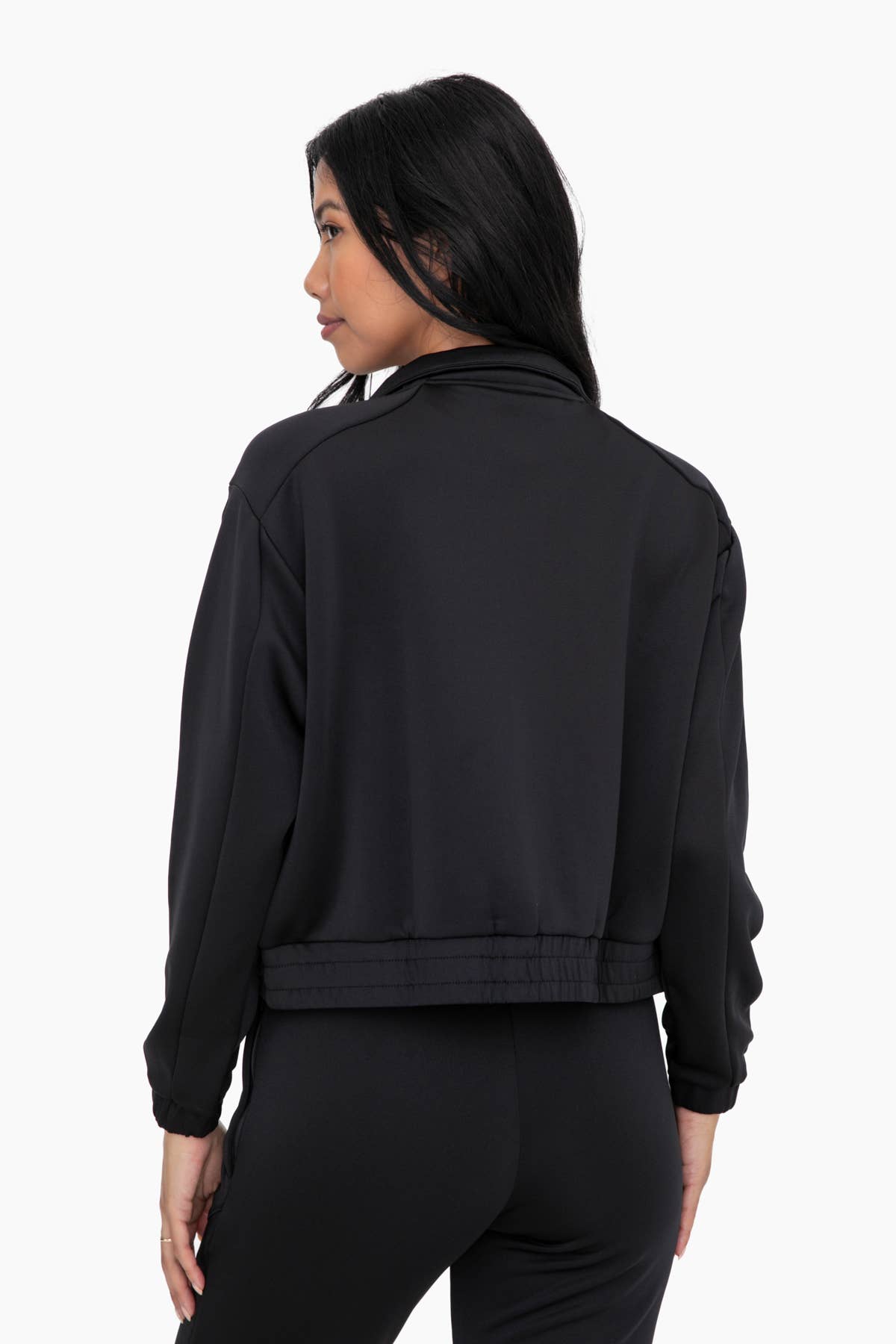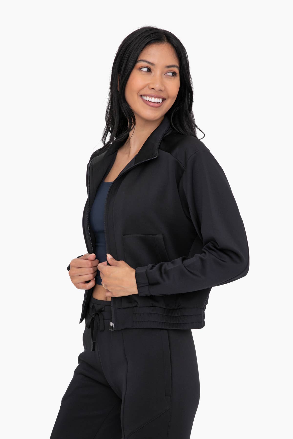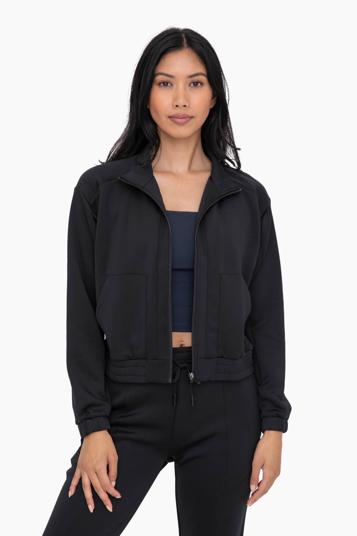 With a full zip and mock neck, this active jacket will keep you warm before and after your workouts! It features a cuffed hemline, a relaxed silhouette, hand pockets, and long sleeves with cuffed wrists.
