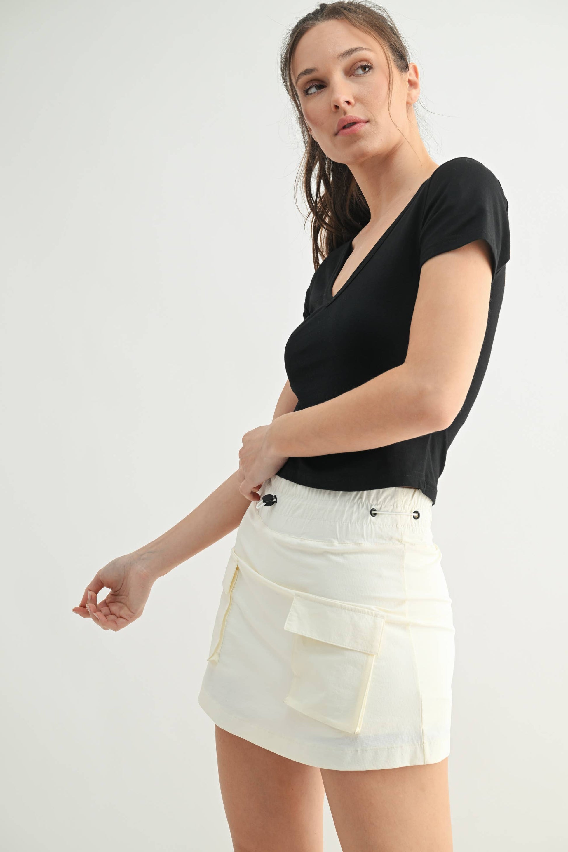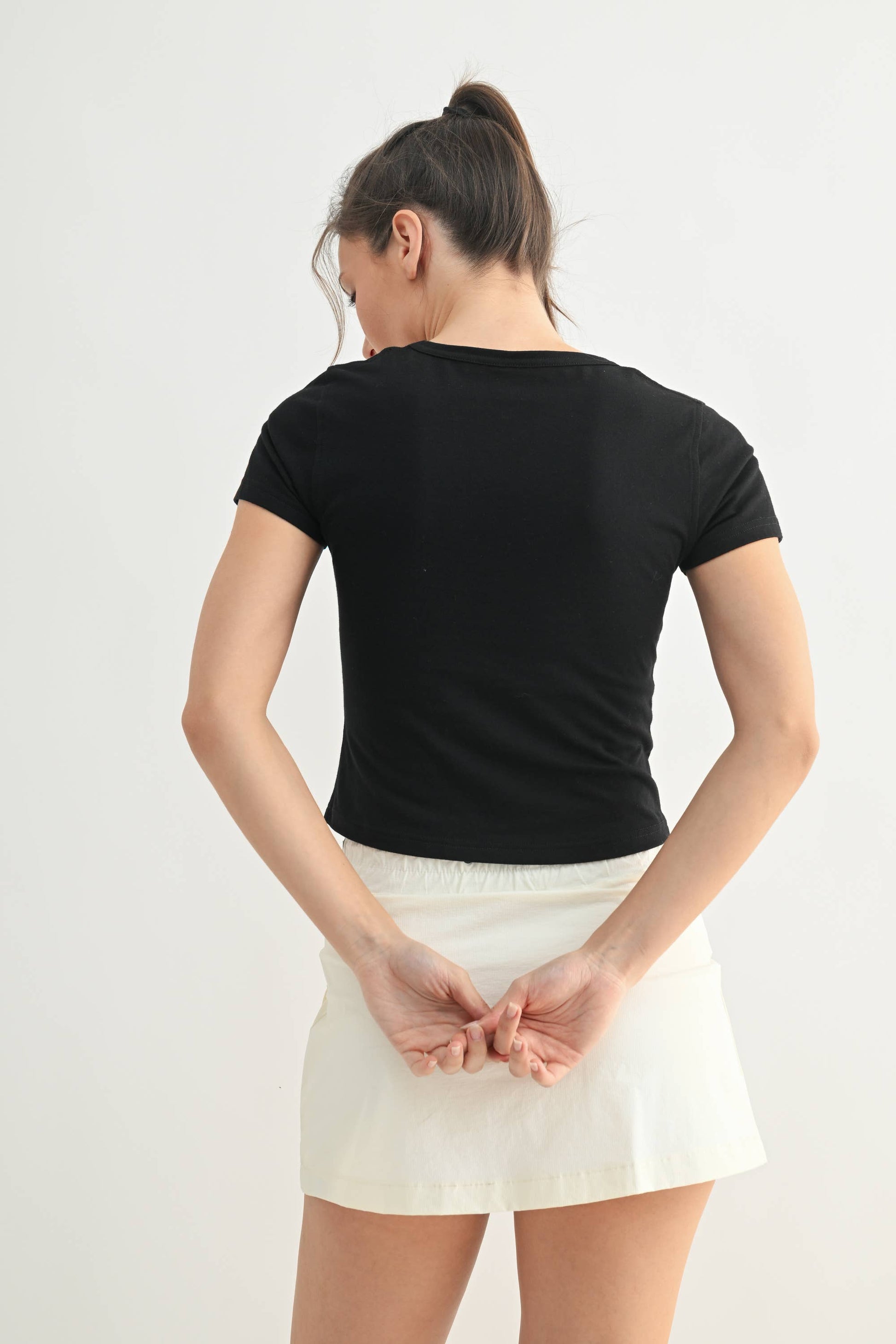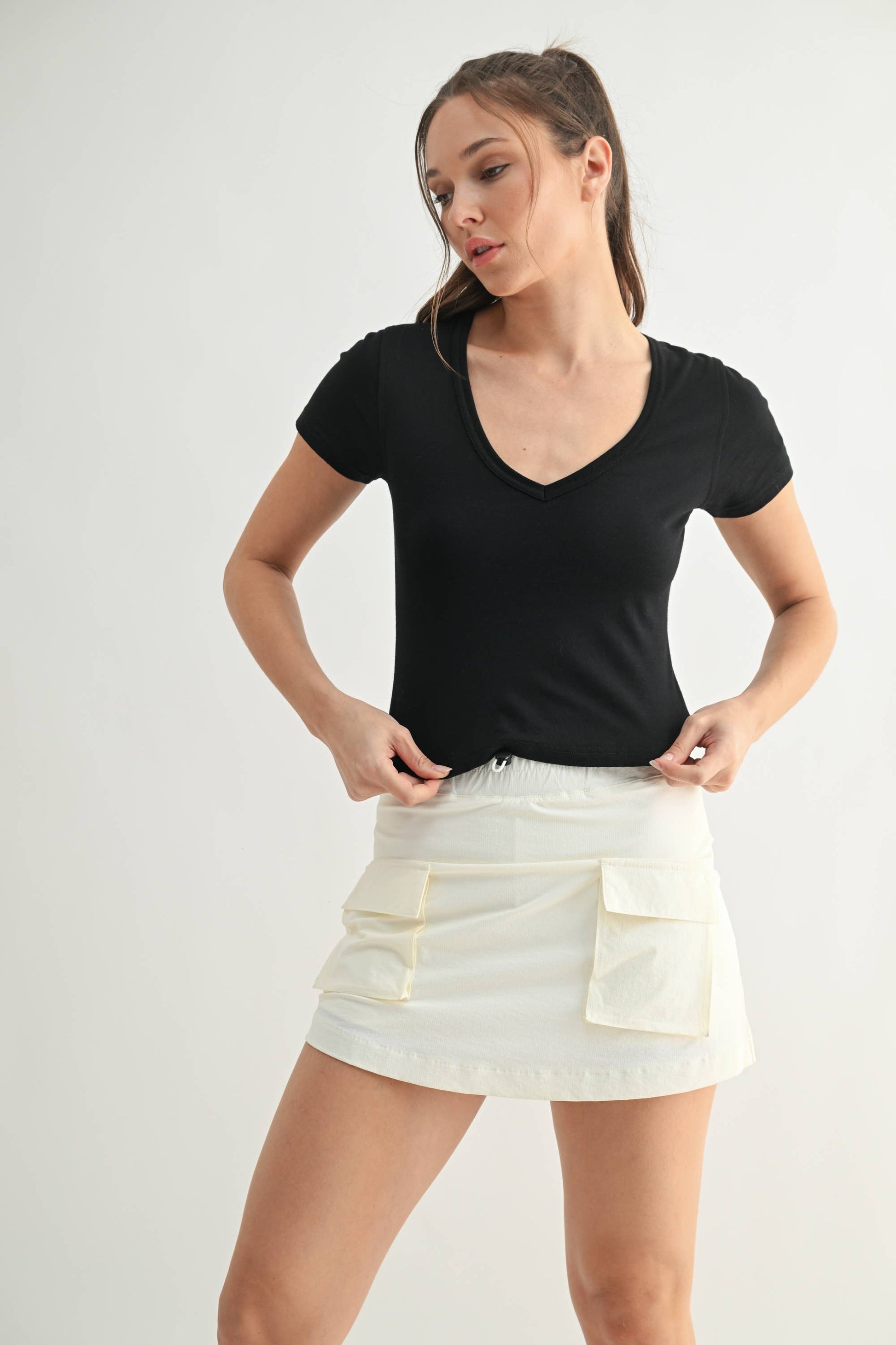 Stay chic with our baby fit V-neck short sleeve shirt. Featuring a wide binding at the neck for added style and comfort.
