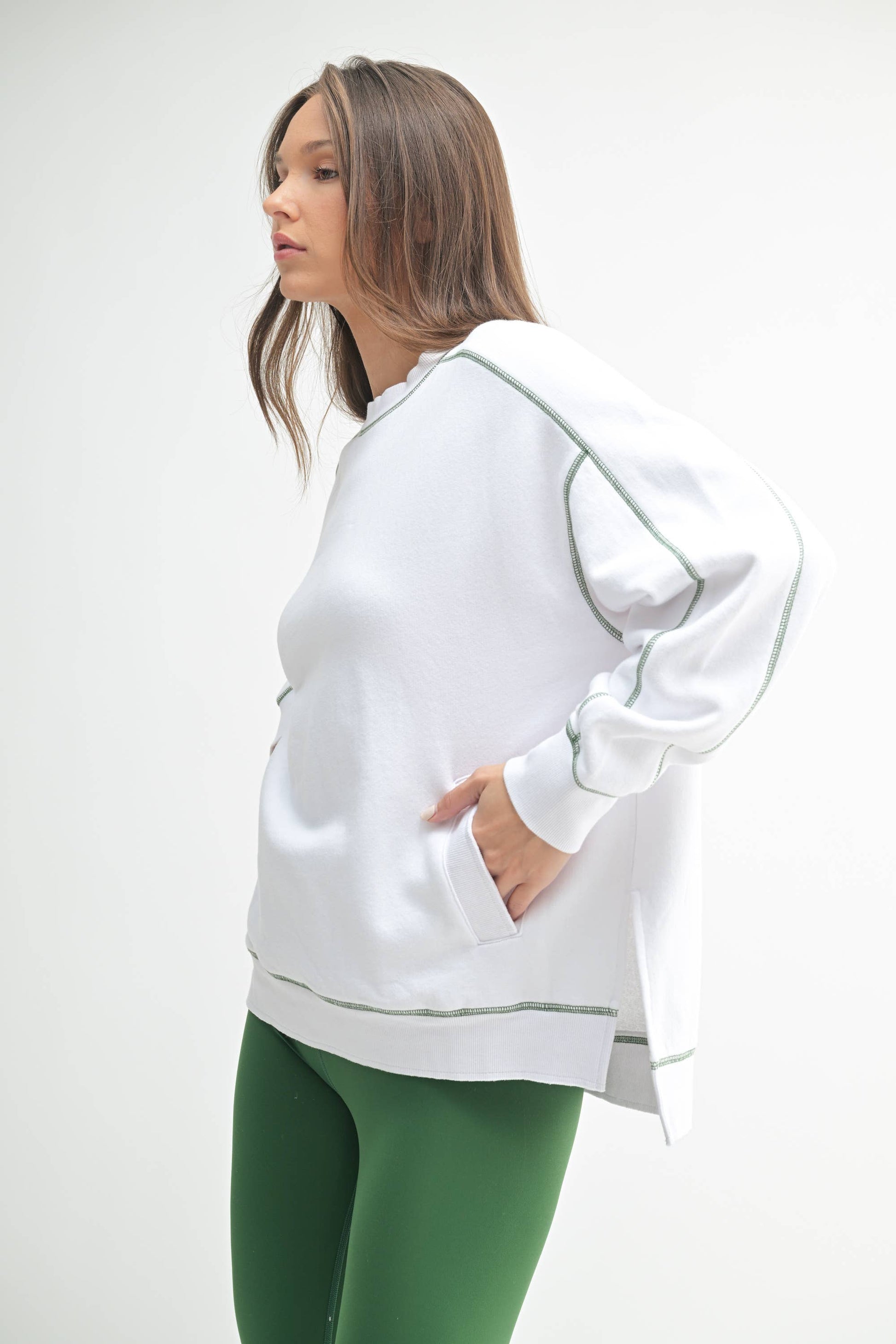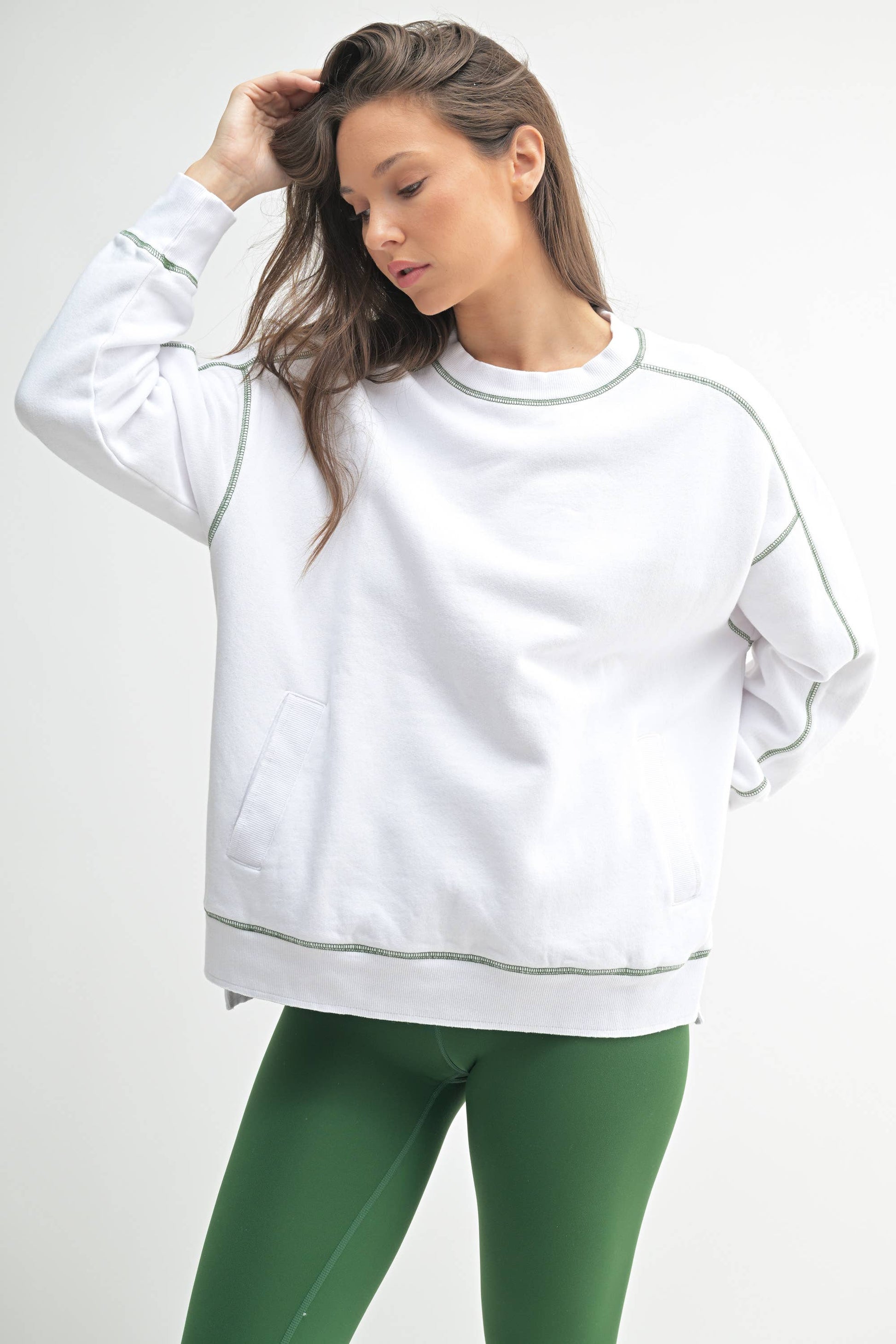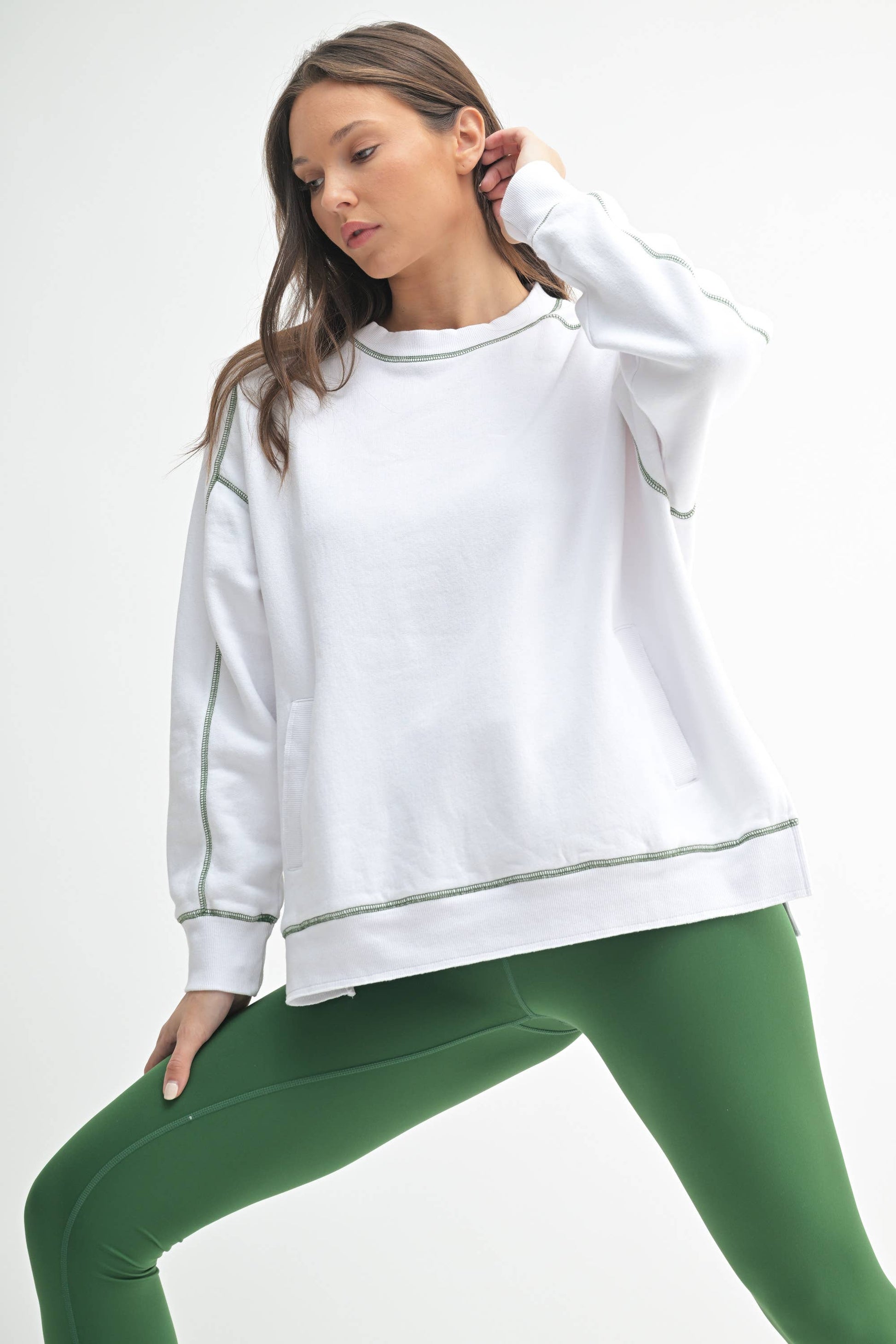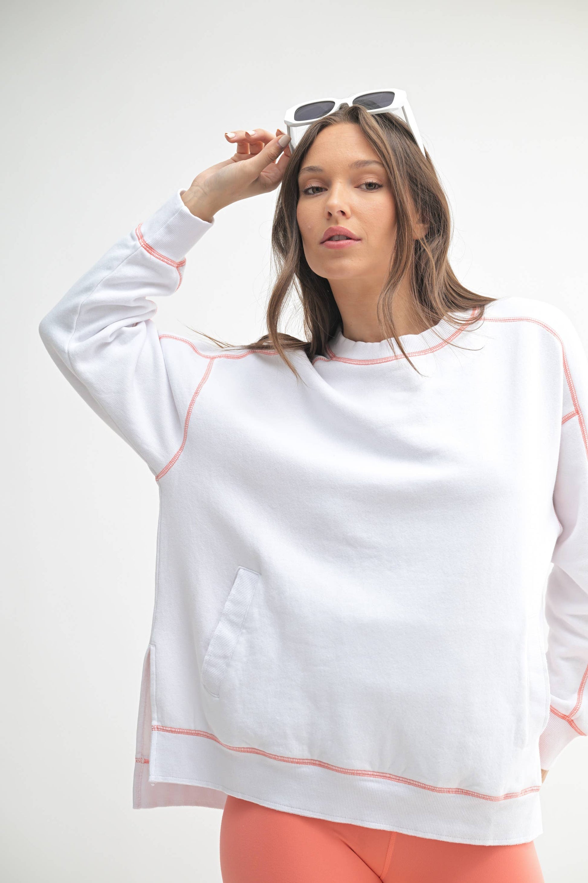 Stay cozy and chic in the Vintage Stitch Cotton Sweatshirt. Crafted from 100% cotton, this sweater features a vintage-inspired contrast thread that pairs perfectly with your favorite leggings. Ribbed side pockets offer both texture and function, while side slits give you room to move and a flattering fit around your hips. The perfect combination of cozy warmth and chic design, this sweater is ideal for casual days and relaxed vibes. Perfectly paired with our BP624 Legging.