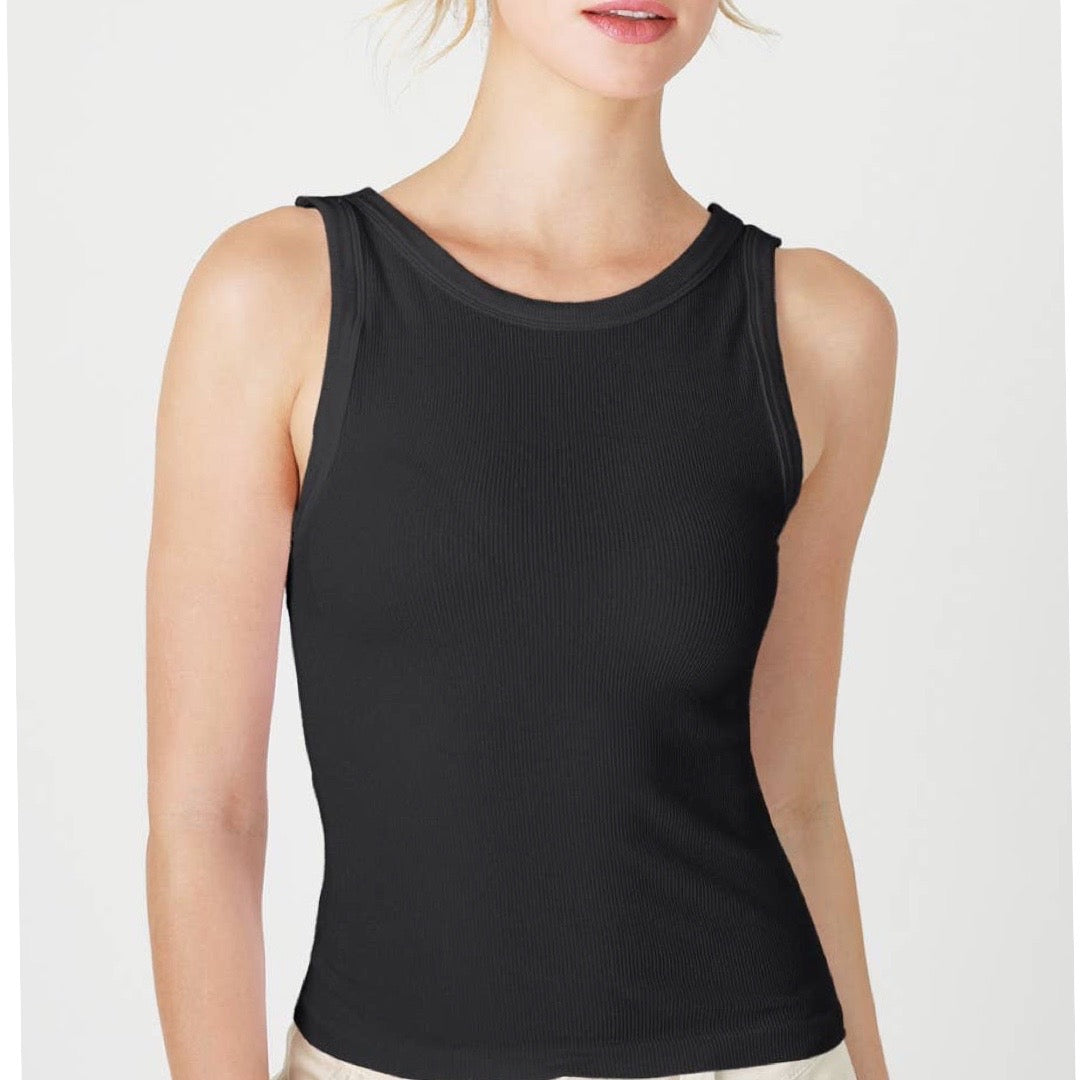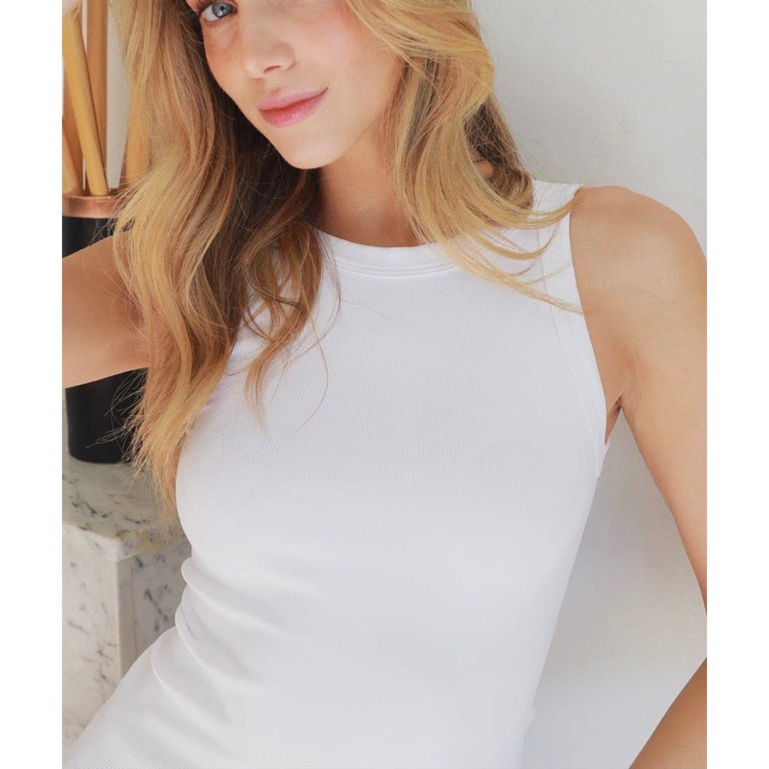 A reversible ribbed knit tank top that can be worn as a scoop neck or turned around to be worn as a crew neck.