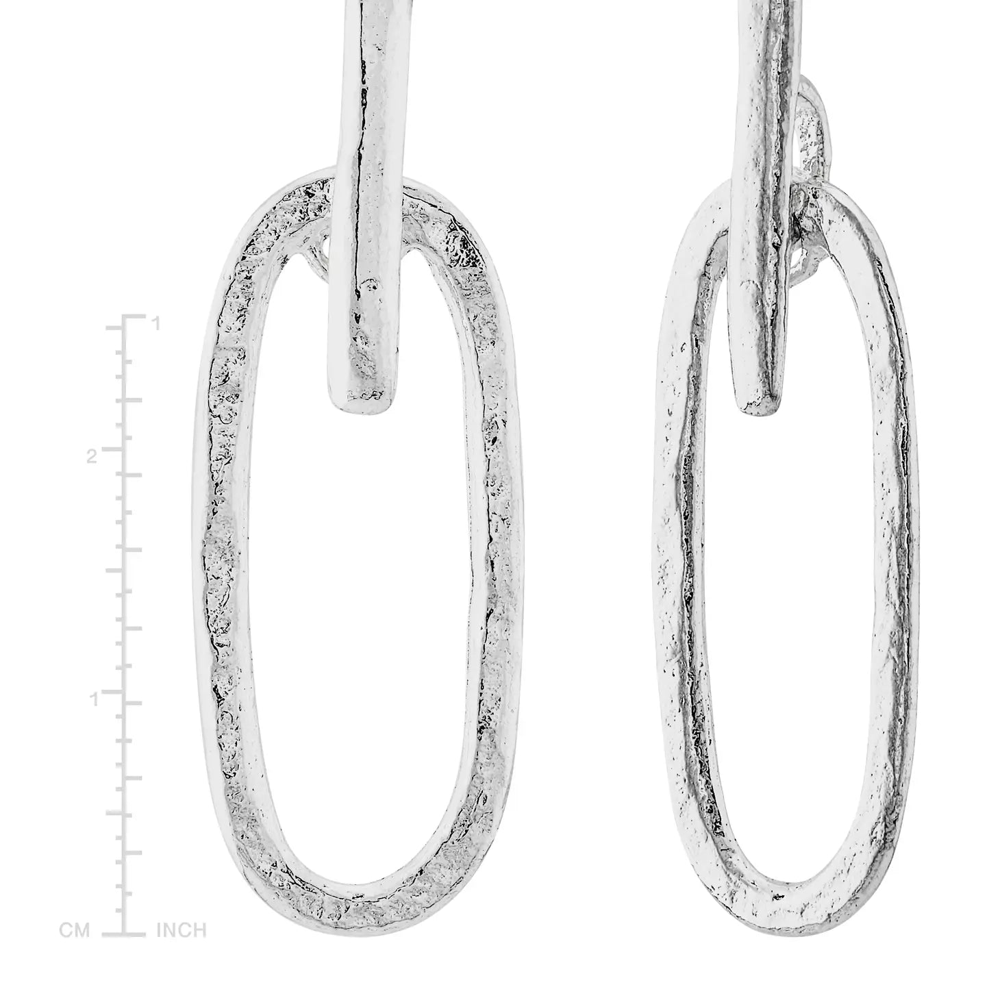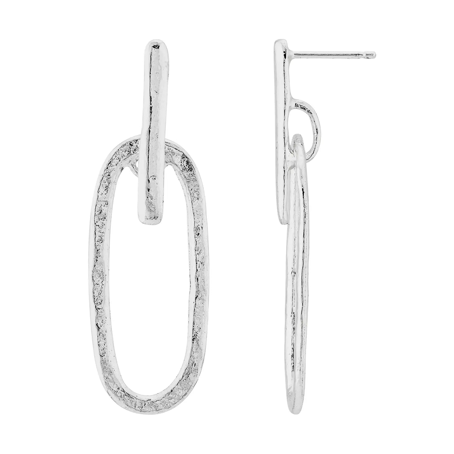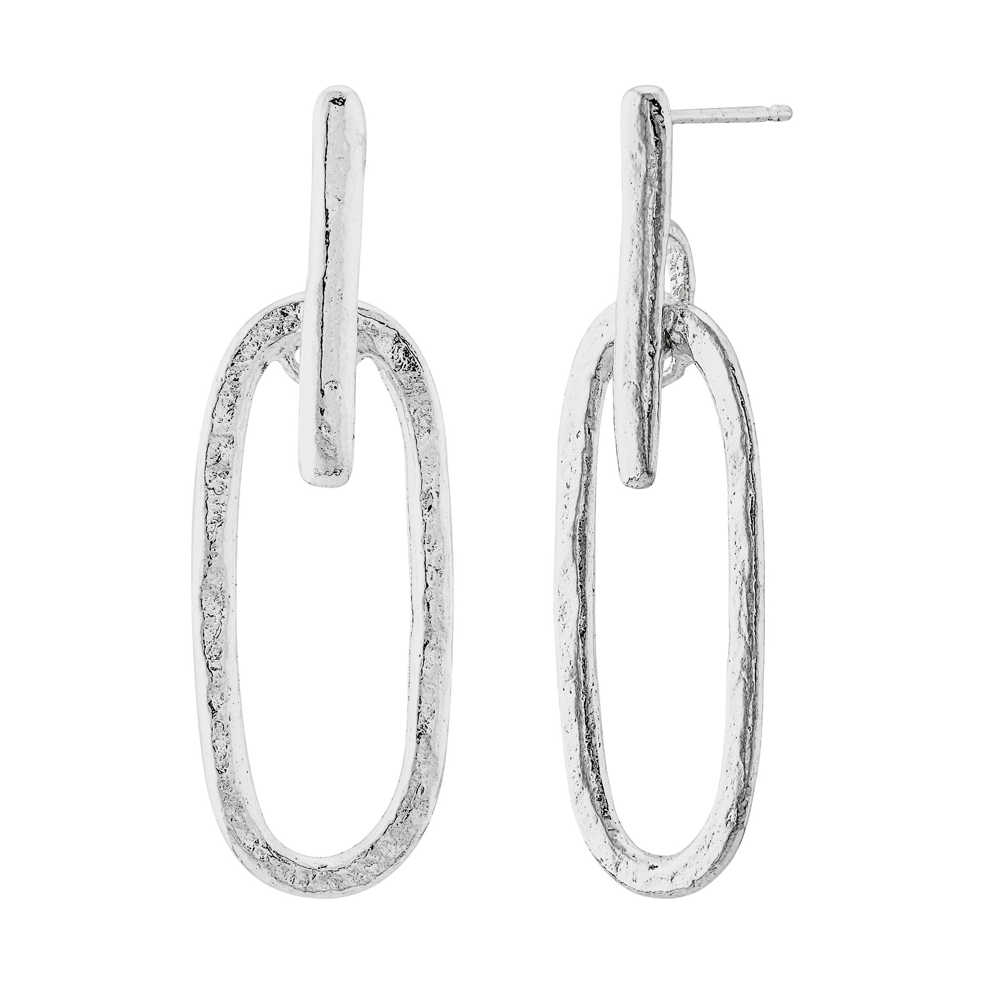 Their elongated oval shape makes them a modern update to hoops, while their silver finish offers a timeless splash of metallic.