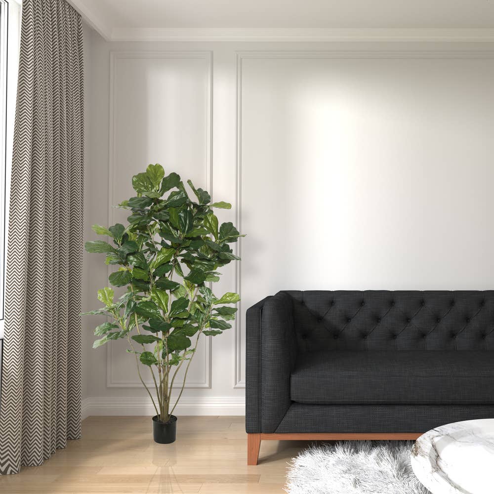 Vickerman 5' Artificial Green Potted Fiddle Tree with 168 Leaves, Comes In A Black Plastic Insertable Pot, Making This Plant Easy To Place In The Decorative Container Of Your Choice. Easy to care for, maintenance free, an occasional light dusting is all that is needed.